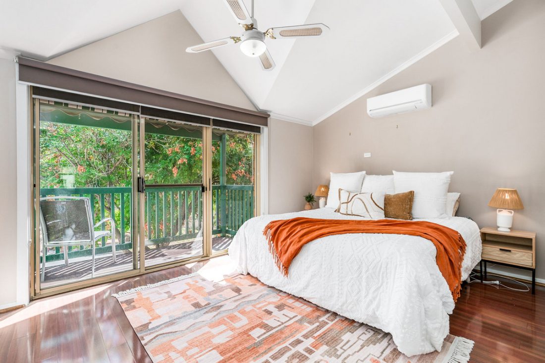 Upstairs, all three bedrooms feature vaulted ceilings for a sense of space, plus ceiling fans and split-system air conditioning to keep things comfortable year-round. The master has its own balcony, walk-in robe and direct access to the bathroom, while the other two come with built-ins for extra practicality.