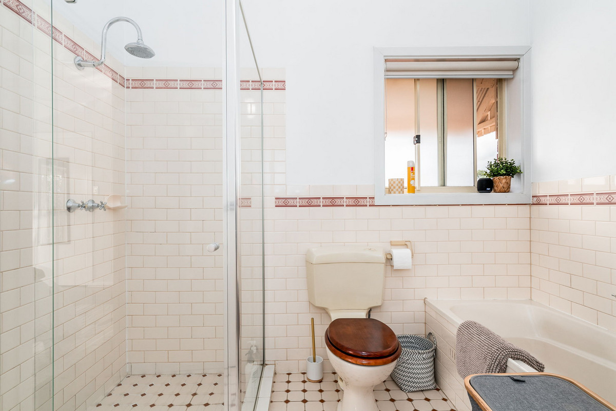 The main bathroom combines charm and function, with subway tiles, patterned flooring, a built-in bath and a roomy shower. A second toilet downstairs keeps things convenient when guests pop over.