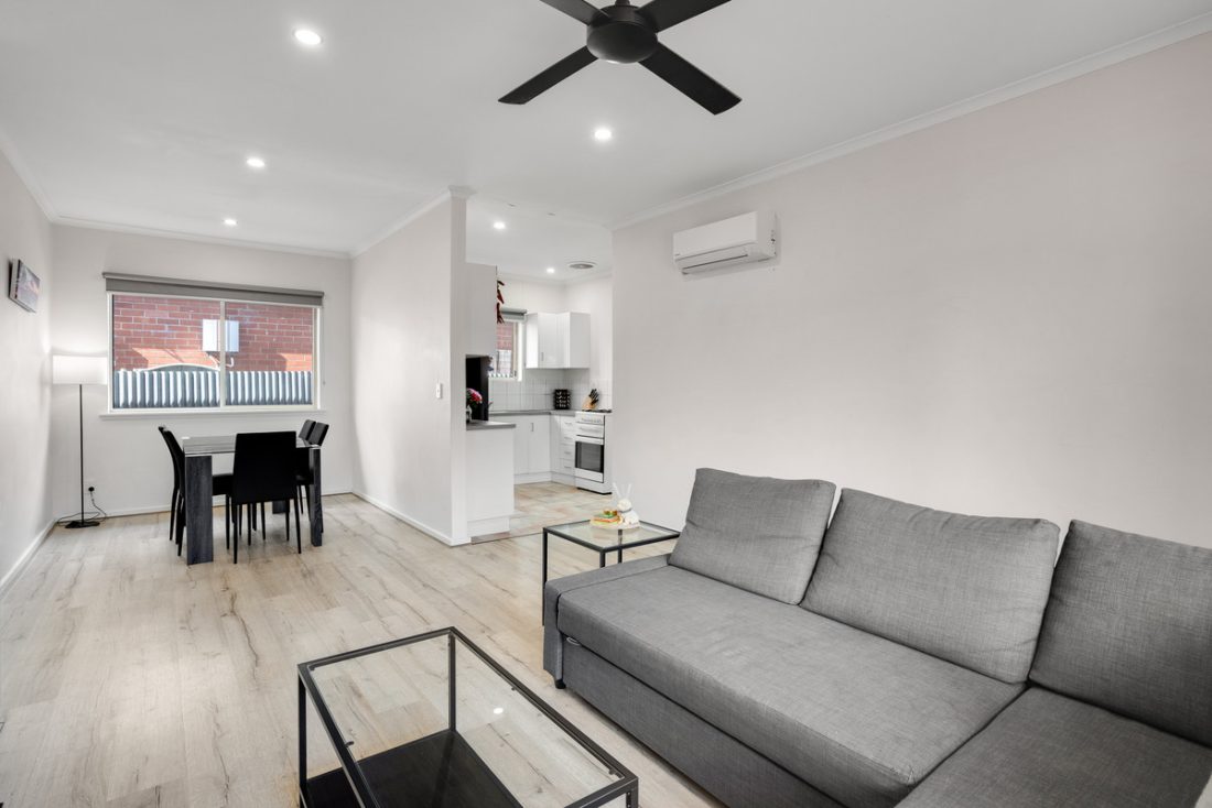 – Open-plan living and dining area, which includes a split system air conditioner and ceiling fan