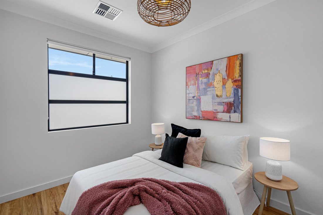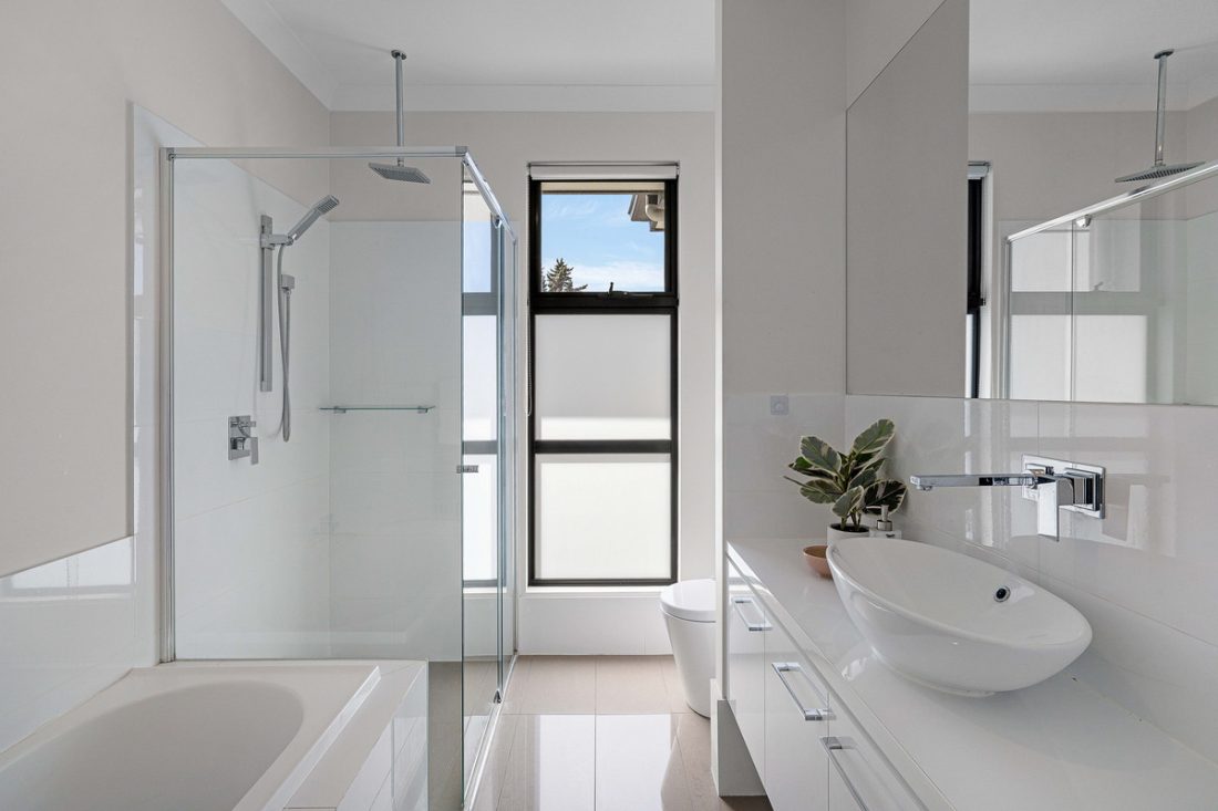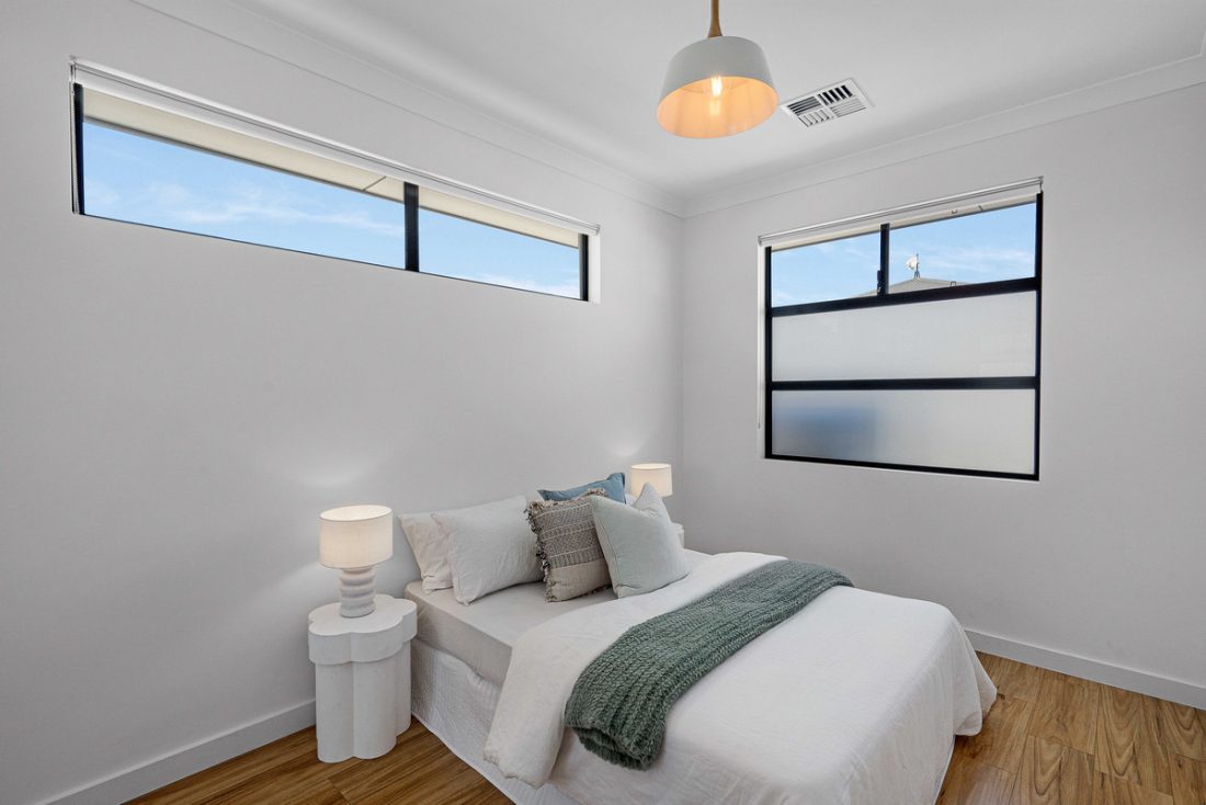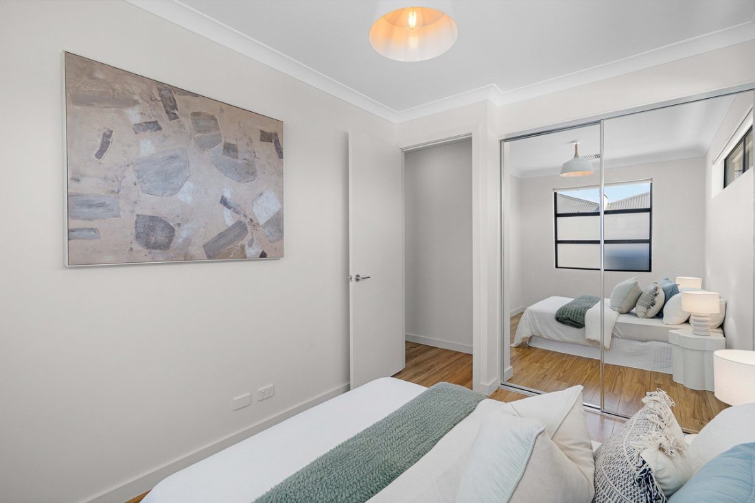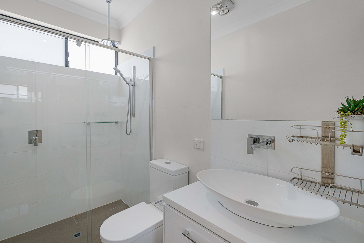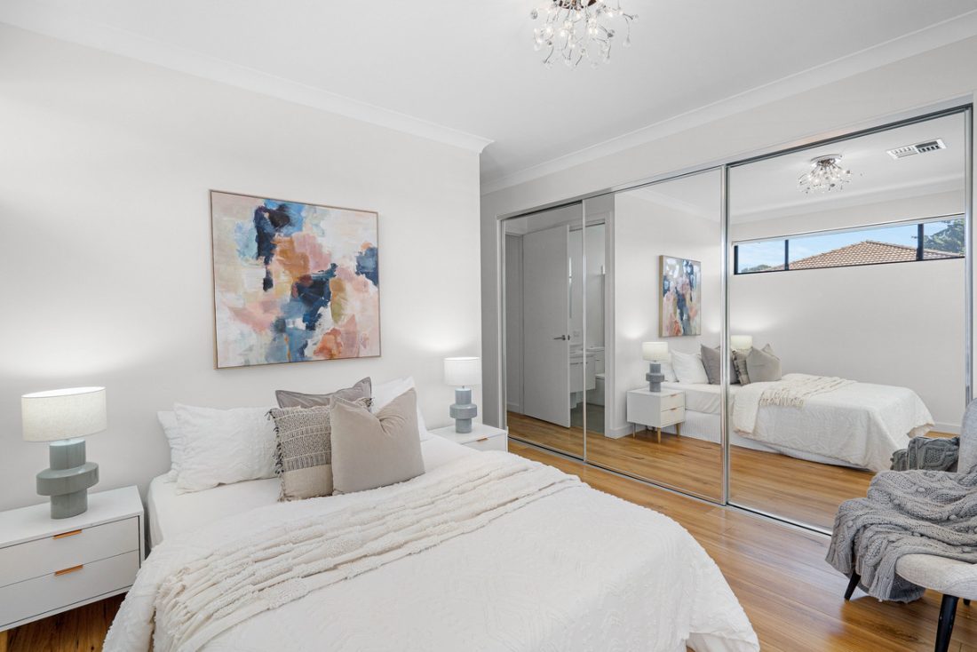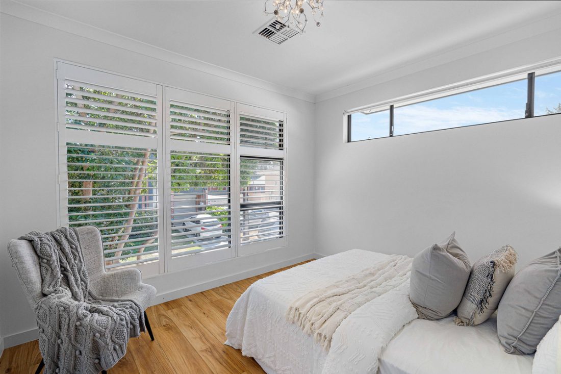 – Master suite includes plantation shutters, mirrored built-in robe, and stylish ensuite with white tiles and rainfall shower