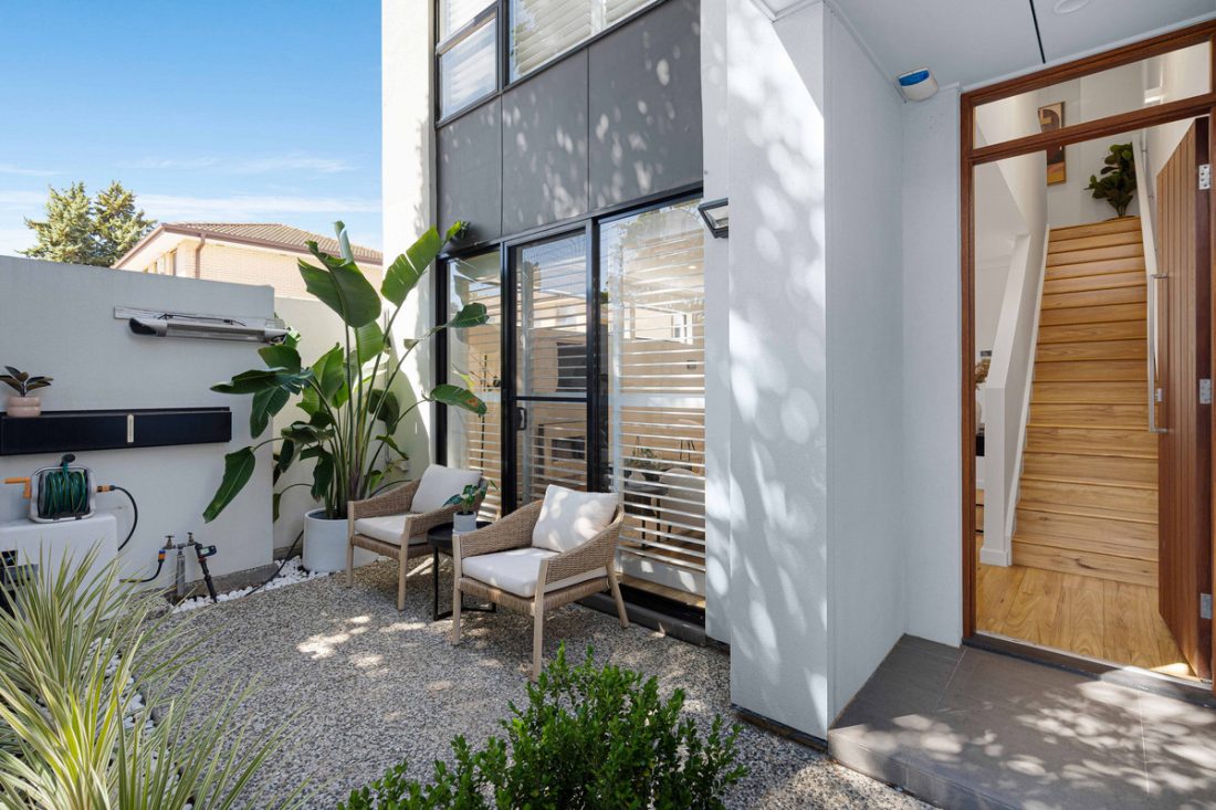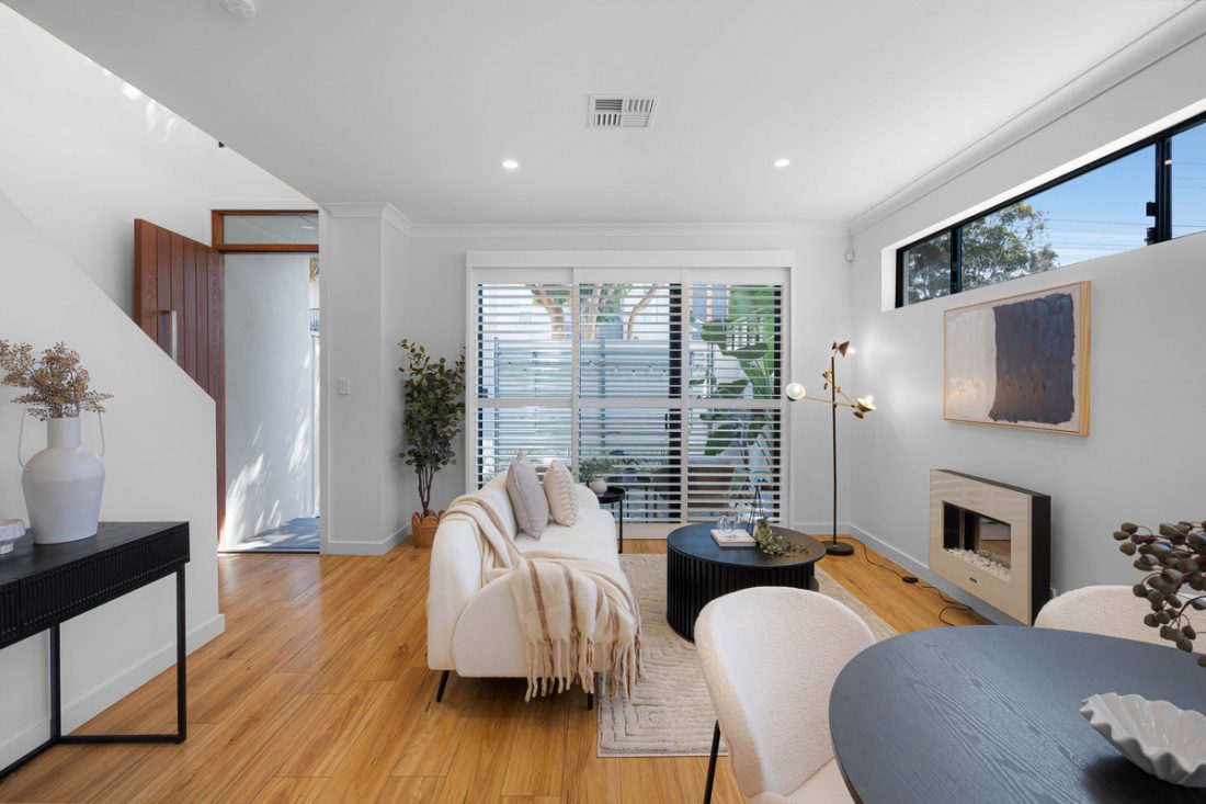 You’ll be greeted by a cosy and beautifully maintained courtyard, setting the tone for whats to come in the home. A sun-drenched open-plan living, dining, and kitchen area welcomes you, perfectly framed by stylish plantation shutters and warm timber floors. The kitchen is a standout, featuring sleek stone benchtops, and quality Smeg stainless steel appliances including a five-burner gas cooktop, oven and dishwasher – Casual dining is made easy with the handy breakfast bar.