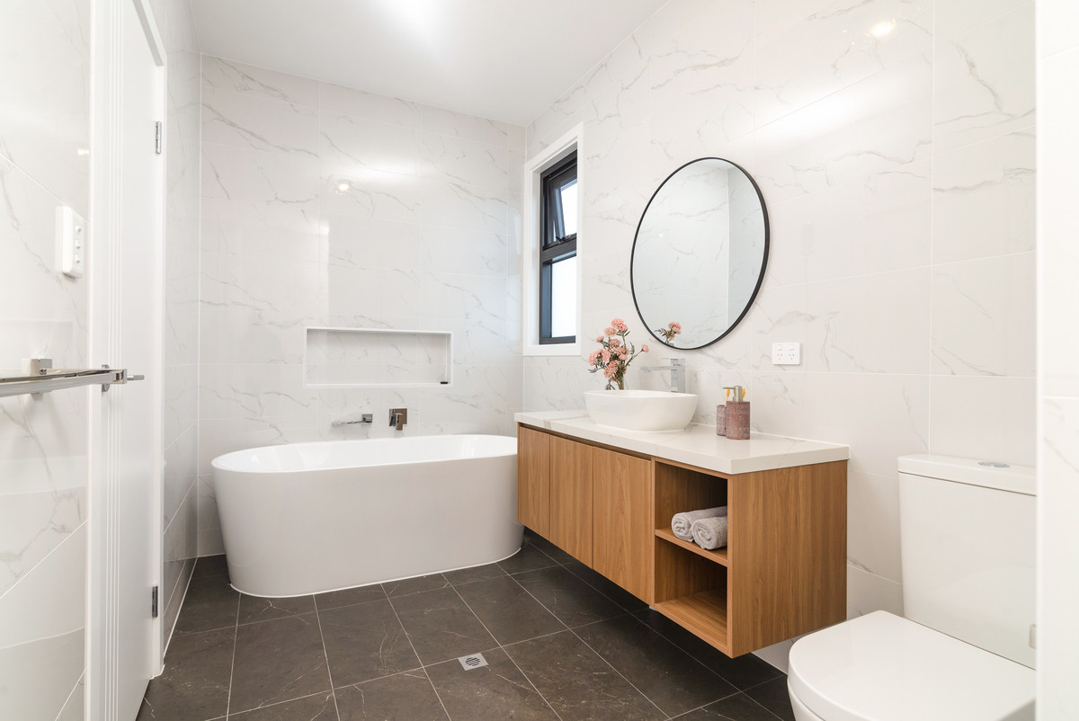 – Luxurious main bathroom with floor-to-ceiling tiling and stone benchtops