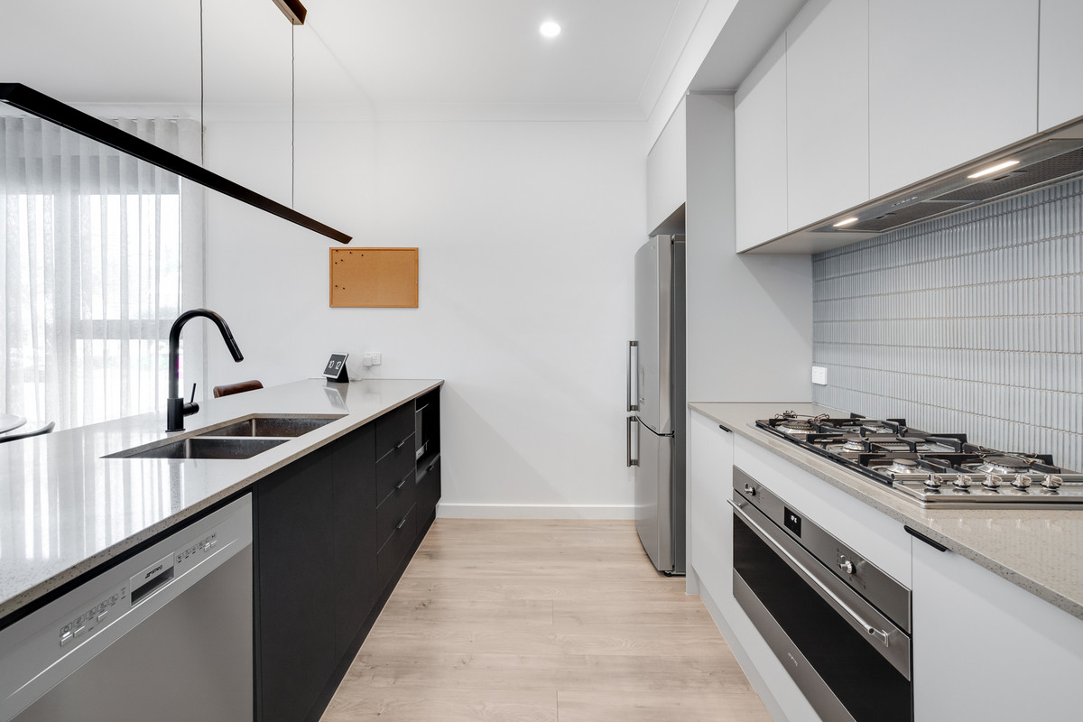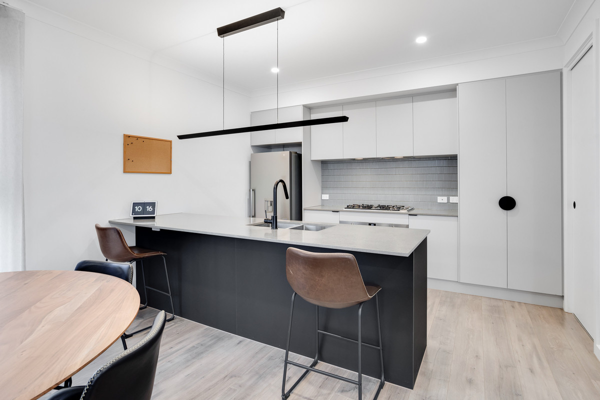 Upon arrival, the rendered facade with striking black windows sets the tone for what’s coming. Step inside and enter the heart of the home—an open-plan living, kitchen, and meals area. Stylish flooring, sleek downlights, and large windows that flood the space with natural light create a warm and inviting atmosphere, perfect for relaxation and entertaining.