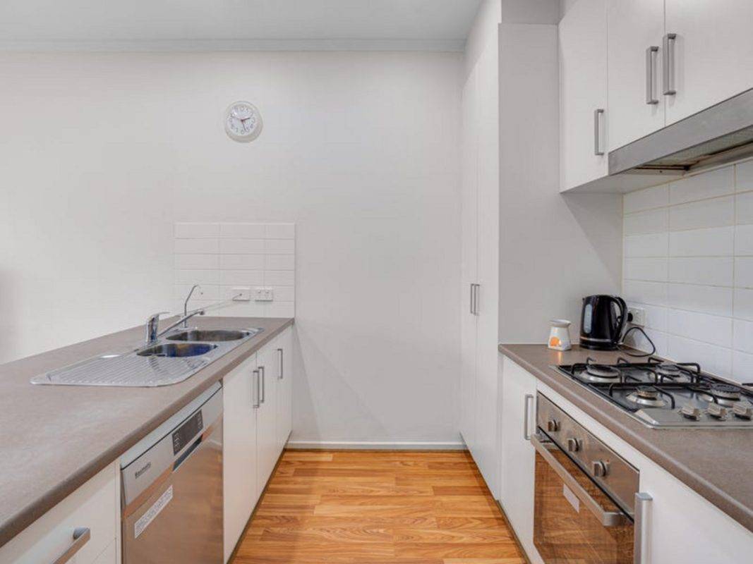 – Modern kitchen with stainless-steel appliances including dishwasher and gas cook-top