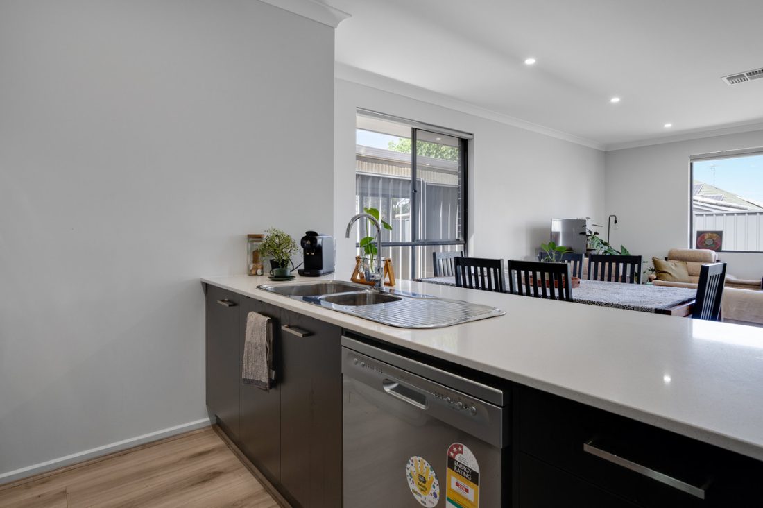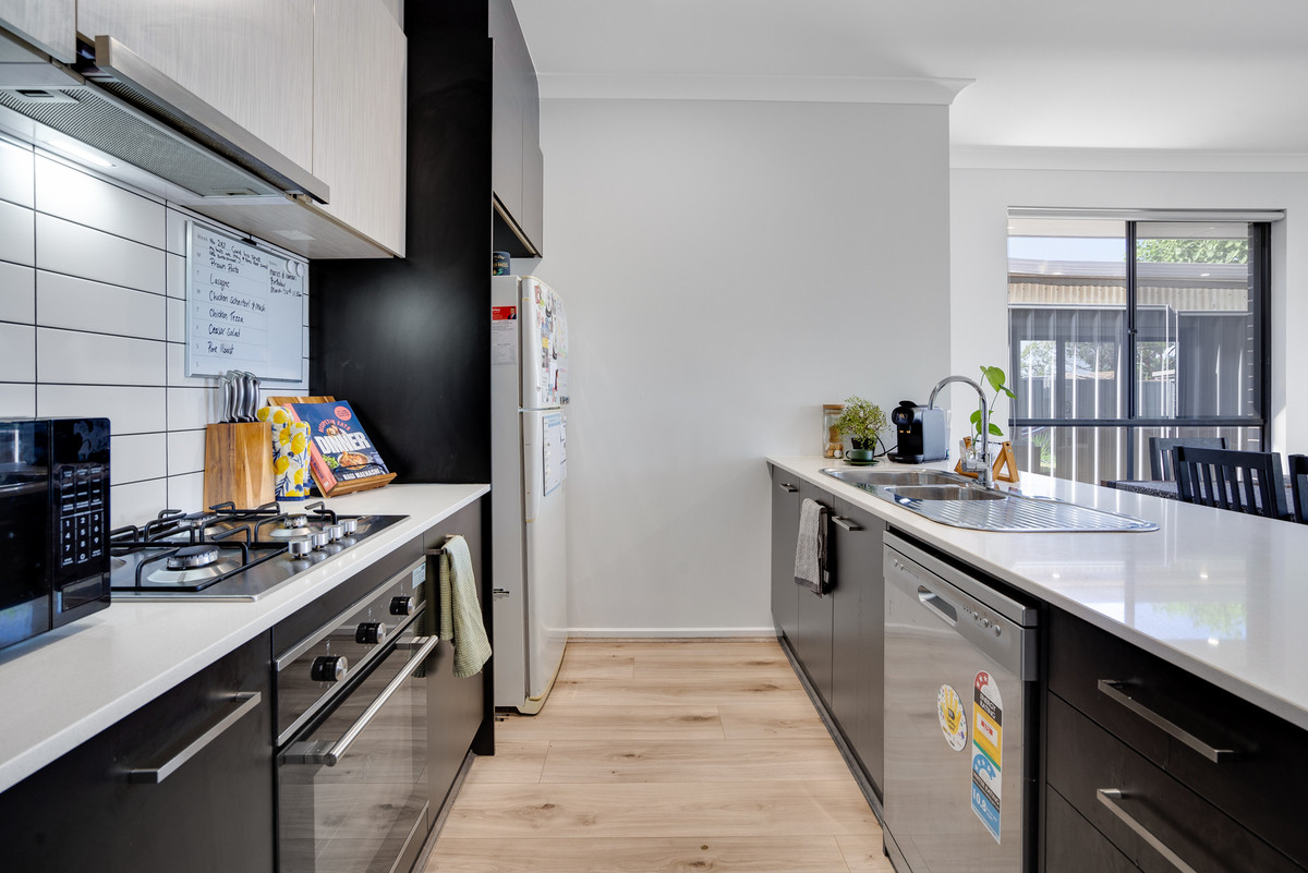 The stylish kitchen is a focal point of the home, featuring stone benches, sleek black cabinetry, stainless-steel appliances, a gas cooktop, and a tiled splashback. Whether you’re preparing a quick meal or entertaining guests, this kitchen provides both functionality and style.