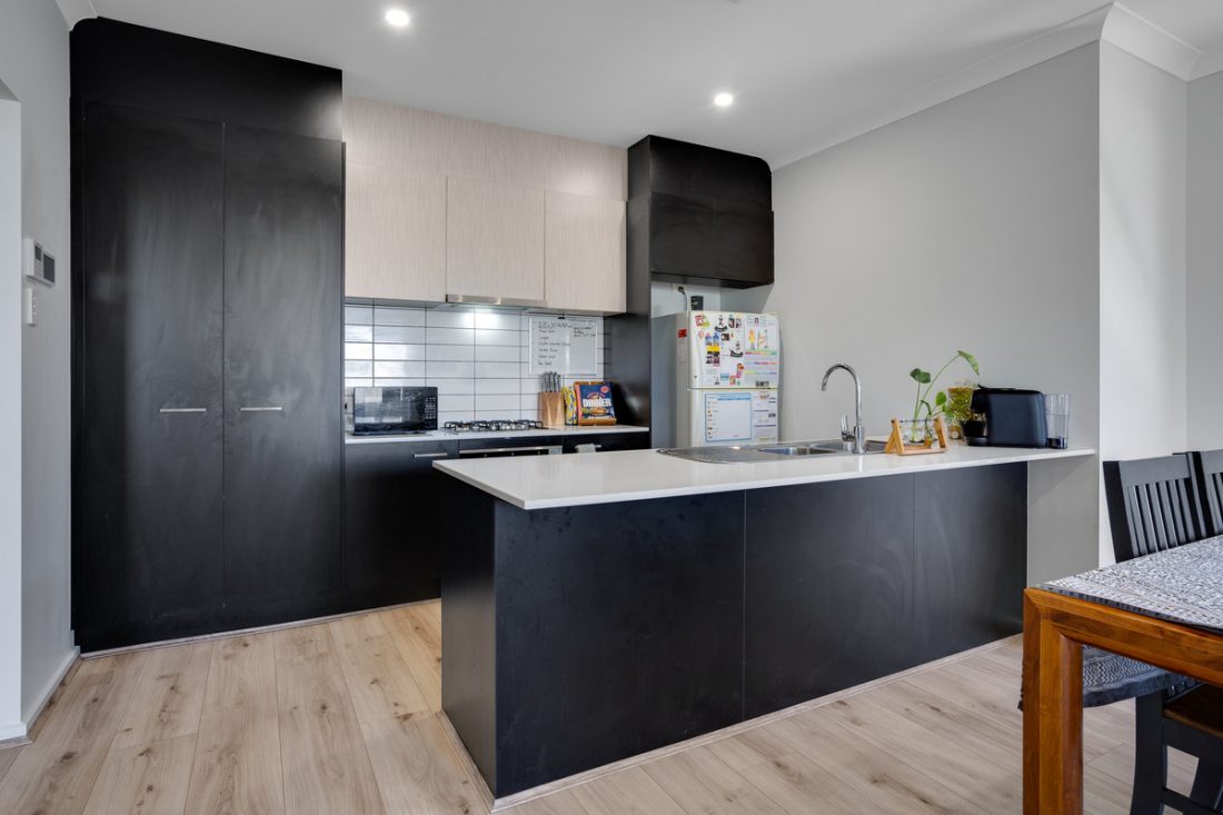 – Stylish kitchen with stone bench tops, black feature cabinetry