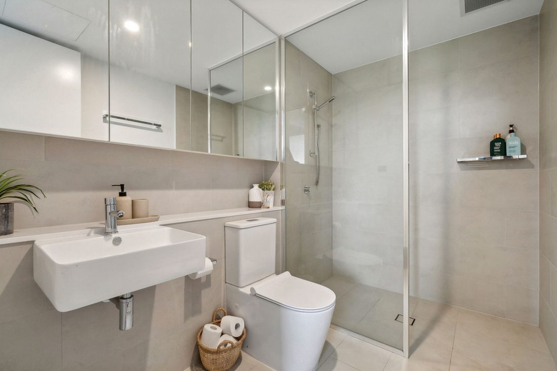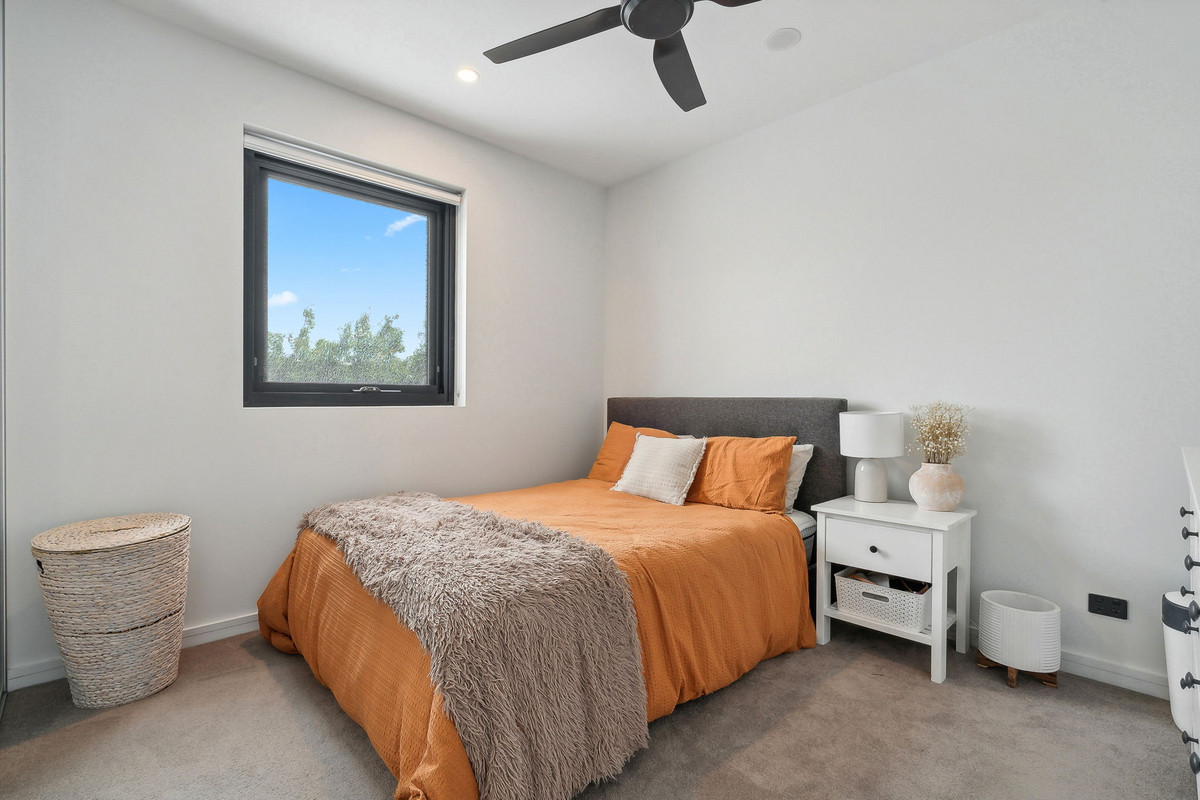 The generously sized bedroom features plush carpet, a built-in robe, and a ceiling fan, while the sleek bathroom boasts floor-to-ceiling tiling, a walk-in shower, mirrored storage, and a built-in ledge, adding a touch of everyday luxury.
