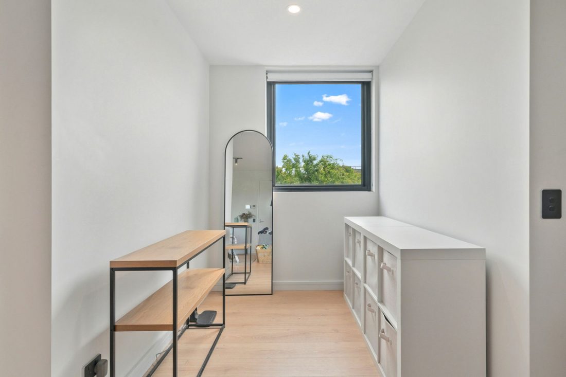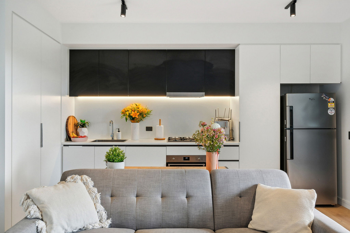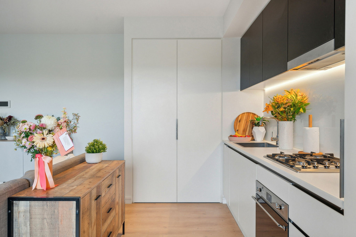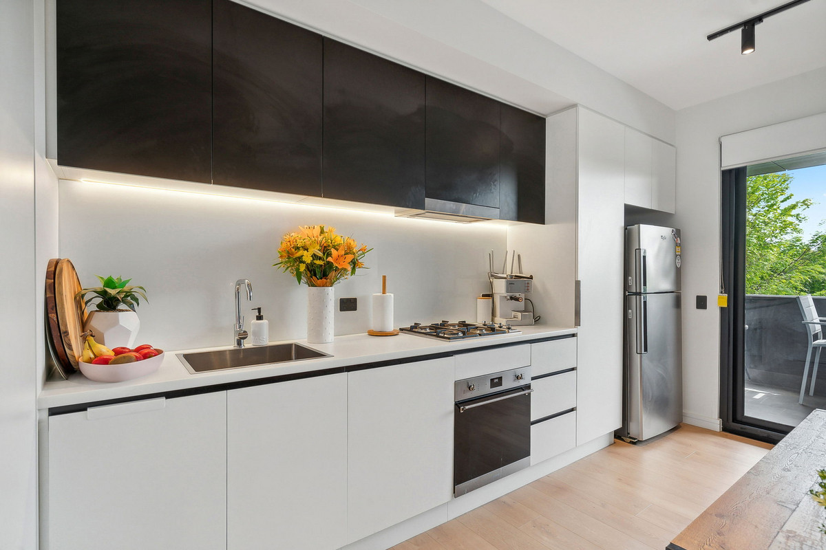 Step inside and be greeted by the spacious, open-plan kitchen, dining, and living area, featuring sleek timber-look flooring and a split-system air conditioner. The designer kitchen impresses with two-toned cabinetry, LED under-cabinet lighting, and modern stainless steel appliances, including a gas cooktop. A discreet cupboard neatly tucks away your laundry nook, combining practicality with aesthetics. Completing the living space is a designated study nook, offering the perfect space for working from home.