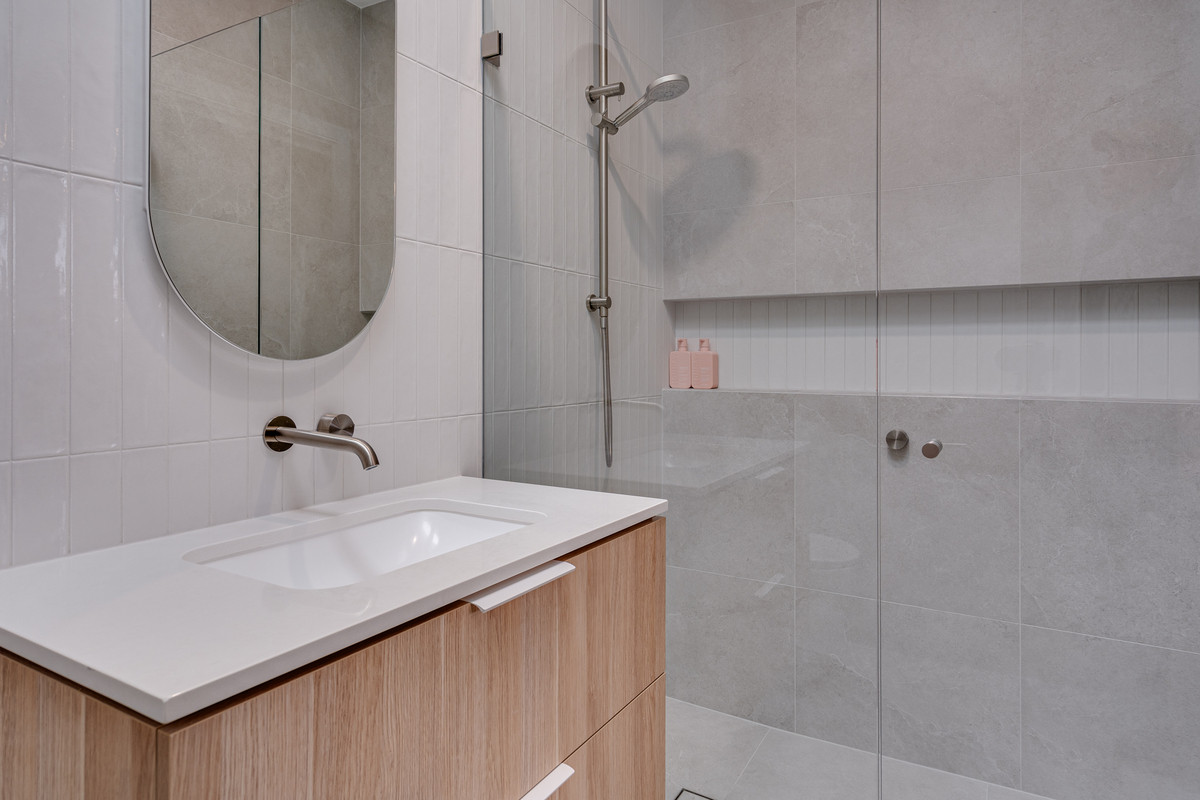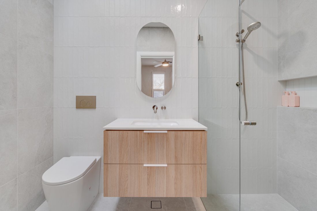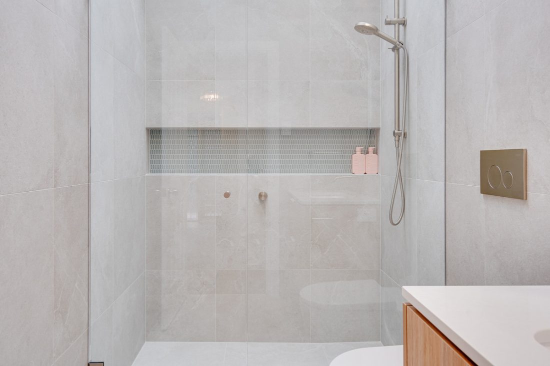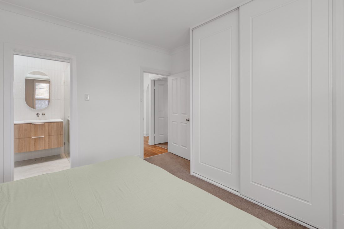The master bedroom is a serene retreat at the front of the home, featuring plush carpeting, a built-in robe, and a luxurious ensuite. The as new ensuite boasts sleek, modern finishes including floor-to-ceiling tiles, a floating vanity, skylight, and a frameless shower with a built-in niche.