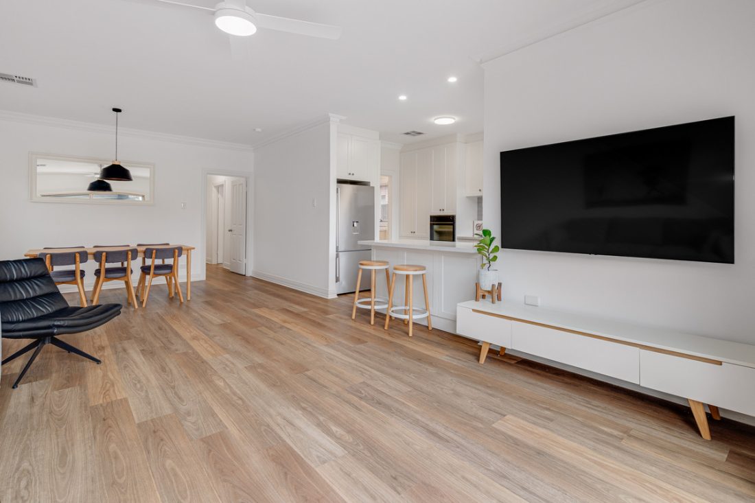Step inside and be greeted by a welcoming atmosphere characterised by high 2.7m ceilings and a completely transformed interior with luxury fixtures and fittings. Venture further to find the expansive open-plan family room and kitchen, destined to be the heart of the home for family gatherings and entertainment. Sunlight pours in through north-facing glass doors and windows, creating a bright and inviting space.