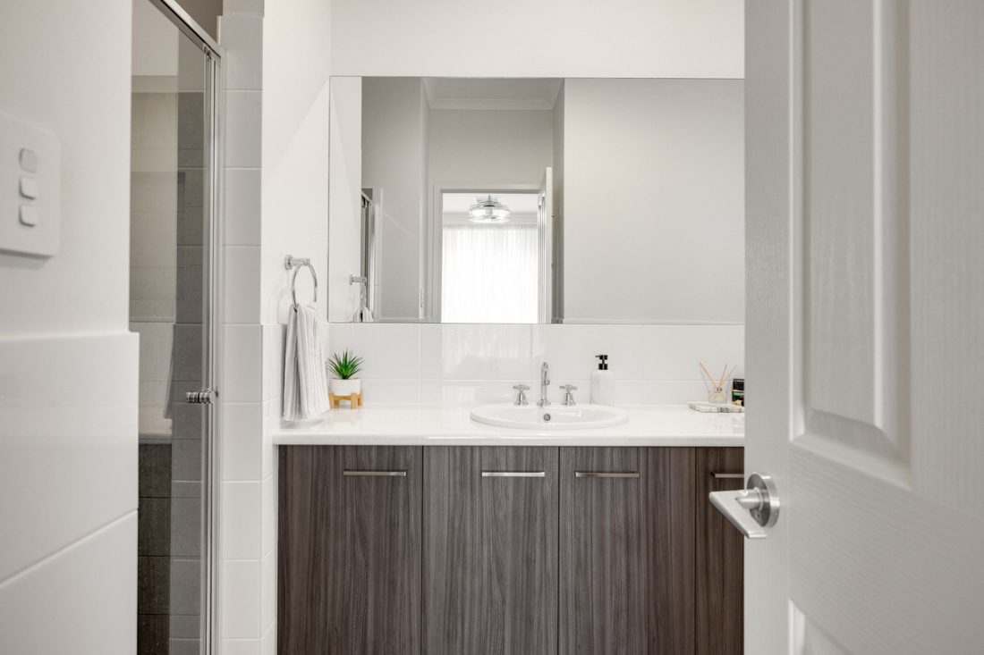 Both bathrooms lean into spa-like comfort, finished with warm wood-toned vanities and generous storage. The ensuite features a double shower, while the main bathroom enjoys a bathtub and a clever three-way layout that makes sharing far more practical.