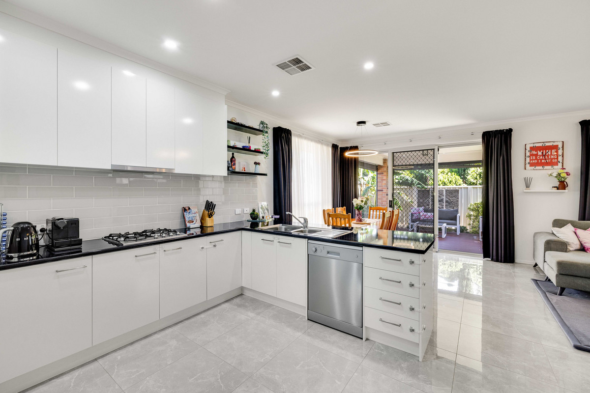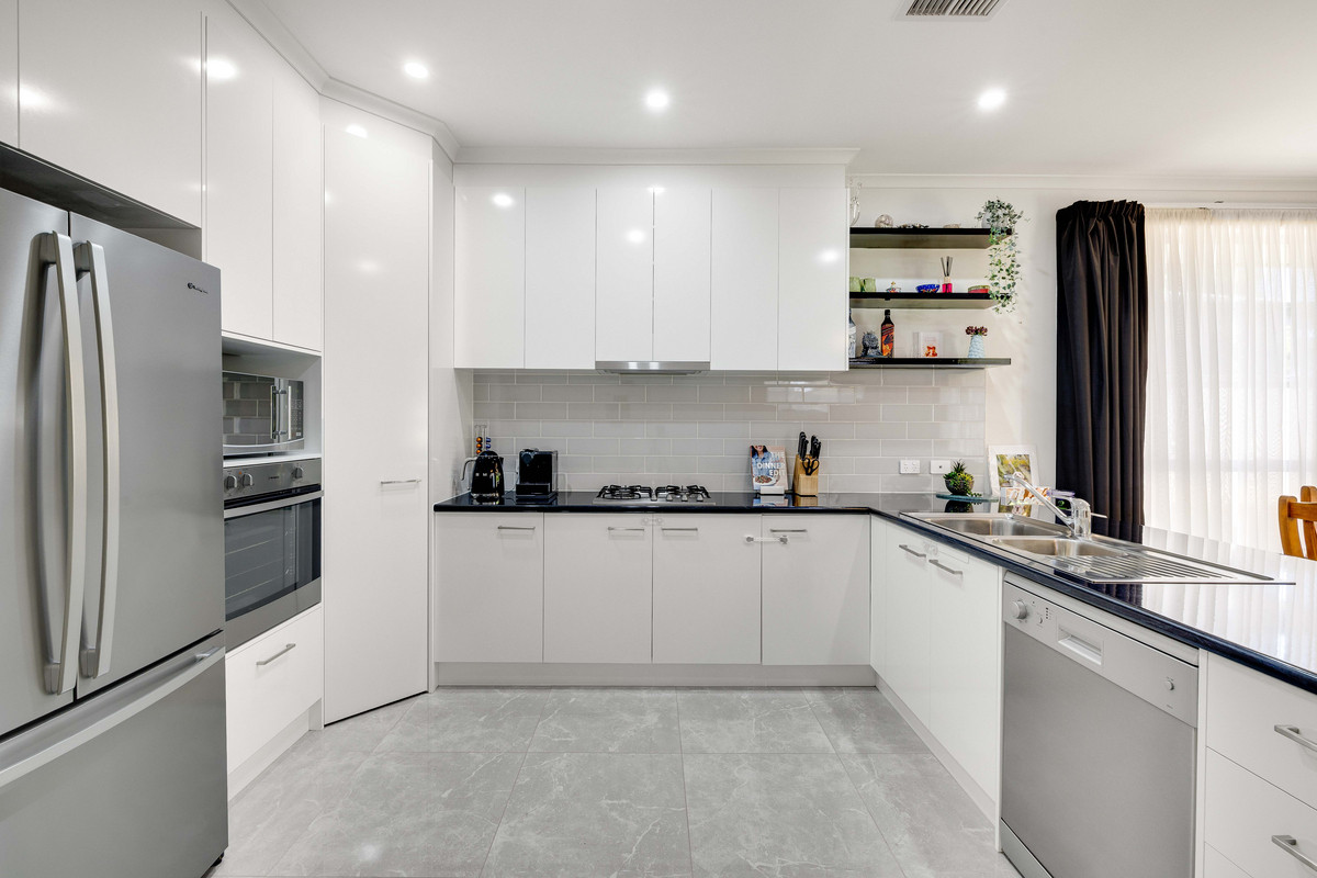 The heart of the home is light, bright and beautifully functional. The kitchen is a true crowd-pleaser, featuring ample benchtop space, crisp white cabinetry, stainless steel appliances including a gas cooktop and dishwasher, plus a breakfast bar with room for stools for those quick bites or morning coffees.