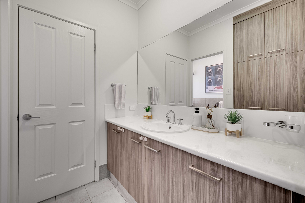 Both bathrooms lean into spa-like comfort, finished with warm wood-toned vanities and generous storage. The ensuite features a double shower, while the main bathroom enjoys a bathtub and a clever three-way layout that makes sharing far more practical.