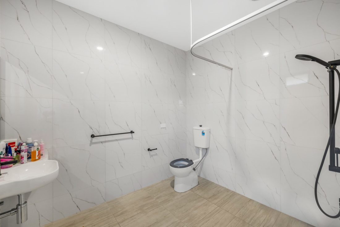 The home provides four bedrooms, each fitted with built-in robes and their own private ensuite bathrooms. Three of these bedrooms feature ensuites designed for accessibility, featuring open showers and generous space for support equipment. A dedicated carer’s bedroom with ensuite ensures comfortable quarters to support 24/7 care for residents.
