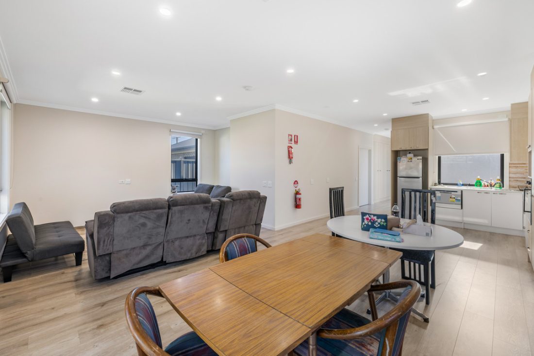 At the heart of the home, the open-plan kitchen, dining, and living area creates a welcoming communal hub. The kitchen is fitted with modern appliances including an electric cooktop, wall-mounted oven, dishwasher, and ample storage, designed for both accessibility and everyday use. Large sliding doors at the rear connect the living space to a low-maintenance private backyard, giving residents a secure and enjoyable outdoor retreat.