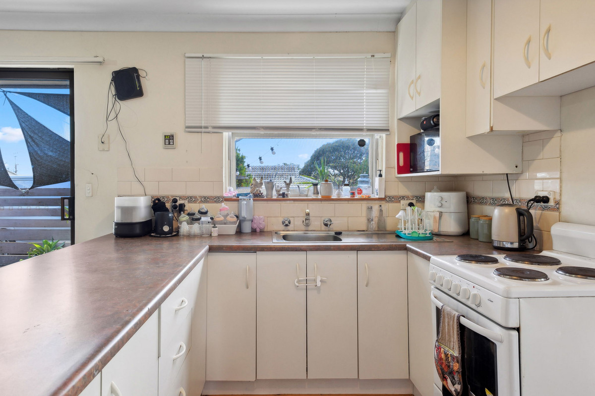 The kitchen and meals area offer a welcoming open-plan layout, perfect for family gatherings. Featuring neutral cabinetry, a tiled splashback, and an electric stovetop, this well-kept kitchen also has a sliding glass door that opens to the patio—ideal for alfresco meals in the warmer months.
