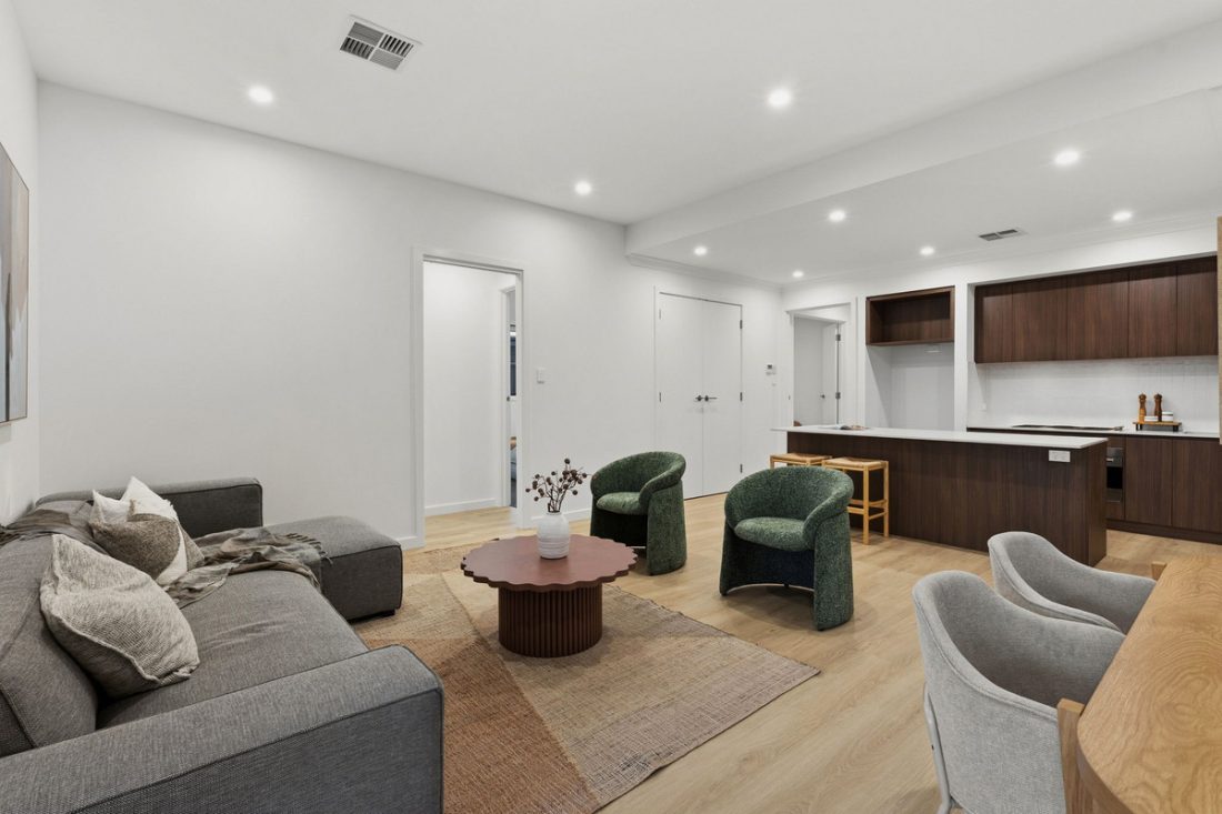 Flowing on, the open plan living and dining area is spacious and well considered, connecting seamlessly to the alfresco. Sliding doors open out to an outdoor entertaining space with downlights and a view over the lawn, giving you the perfect spot to unwind or host without overthinking it.