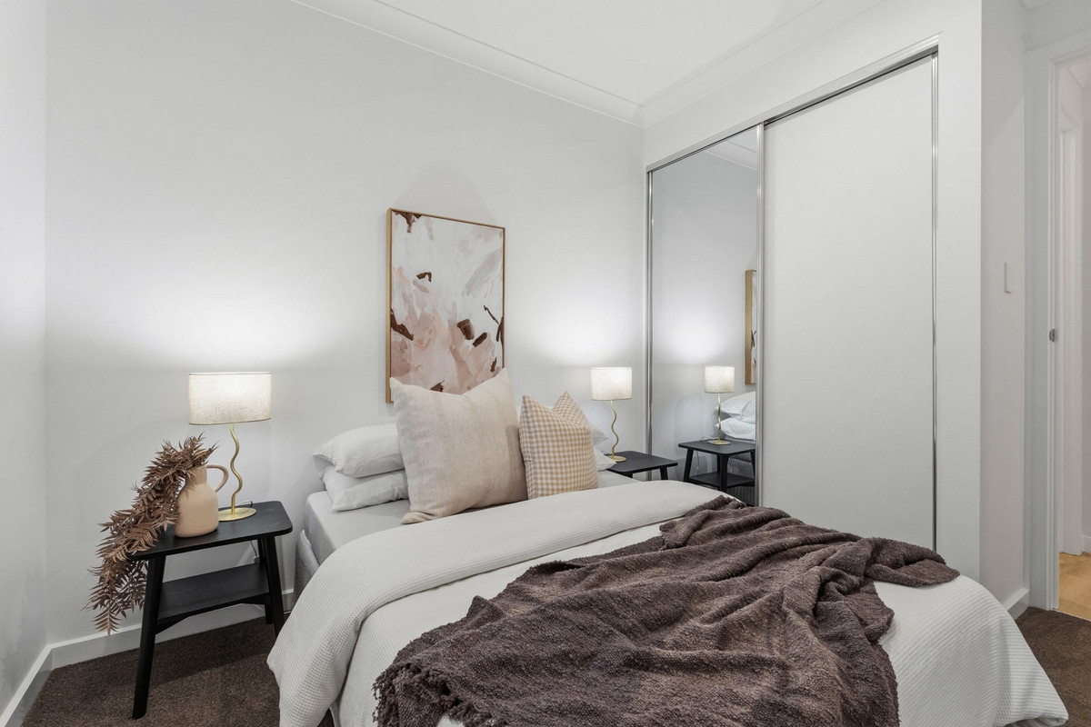 Towards the rear, three additional bedrooms sit in their own wing, each fitted with built-in robes and carpet. The main bathroom mirrors the same clean, modern finishes with a freestanding bath, separate shower and matching terrazzo-style flooring, while a separate toilet adds convenience for busy households.