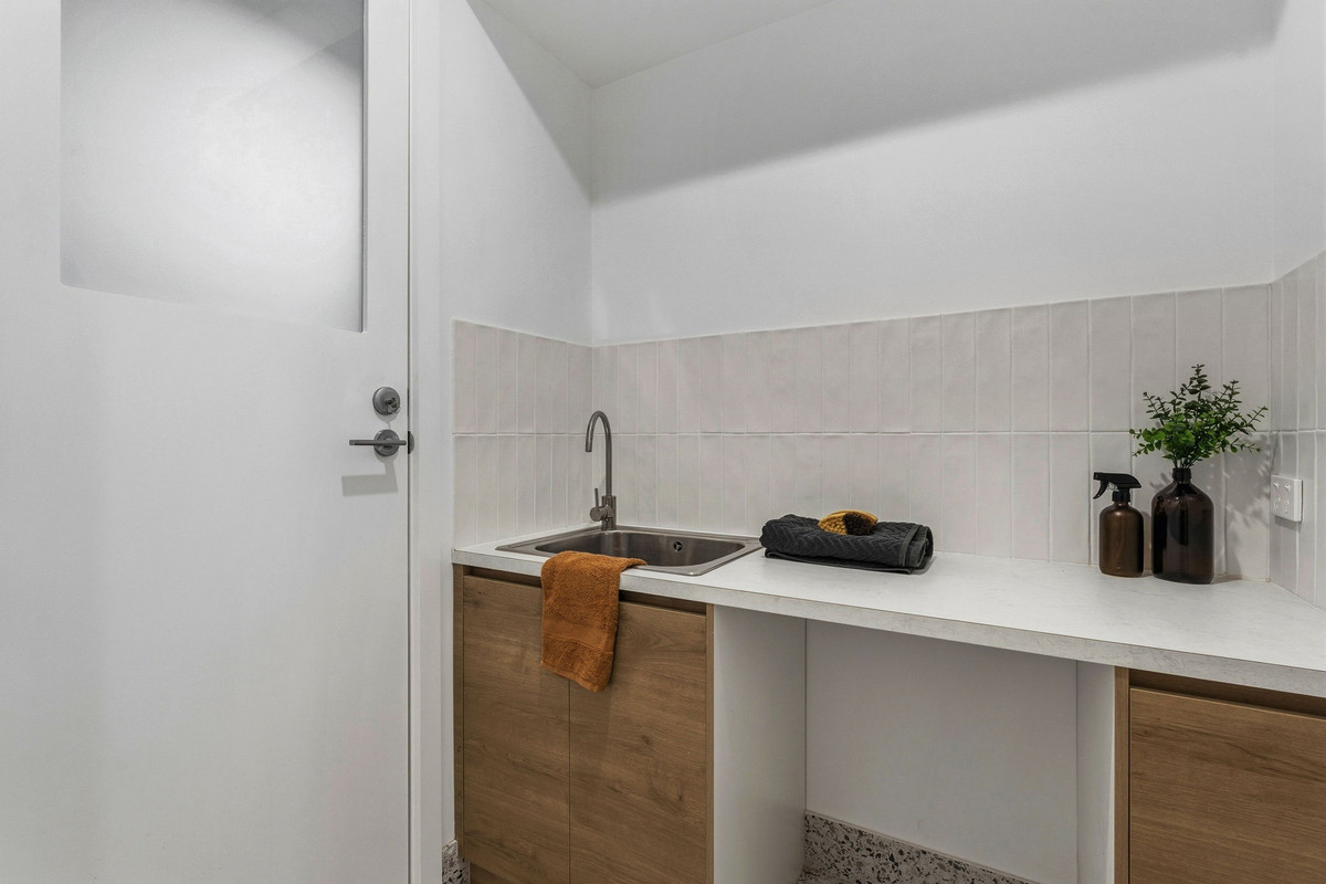 Tucked just off the kitchen, the laundry continues the same clean aesthetic with built-in storage, a subway tiled splashback and direct external access, keeping the practical spaces just as considered as the rest of the home.