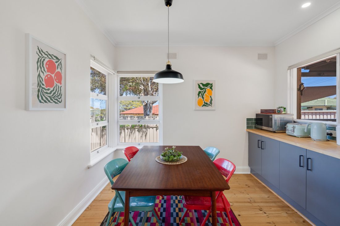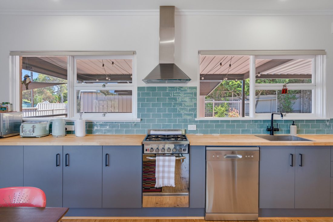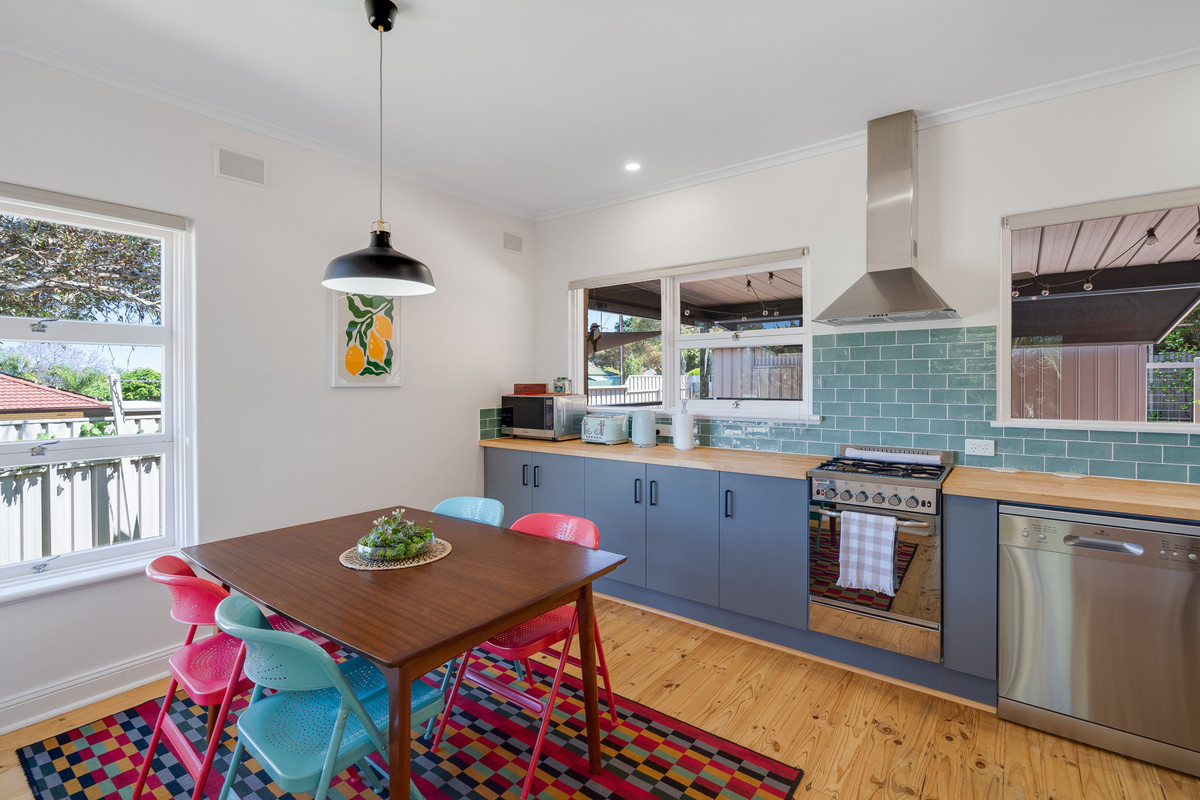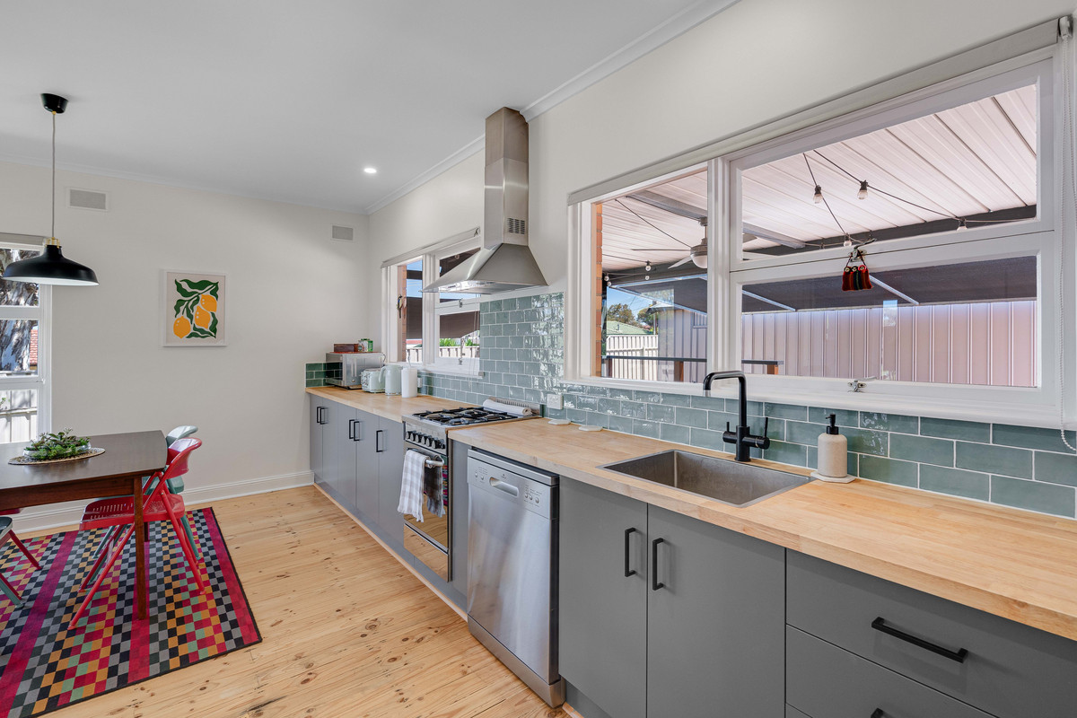 Flowing from the lounge, the open-plan kitchen and meals area is flooded with natural light, creating a cheerful, lively space where cooking and dining are a pleasure. The kitchen’s modern cabinetry, stylish subway tiles, and sleek stainless steel appliances, including a gas cooktop and dishwasher, add to the fresh, contemporary feel.
