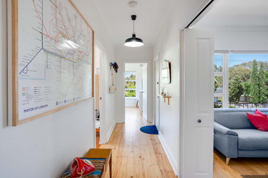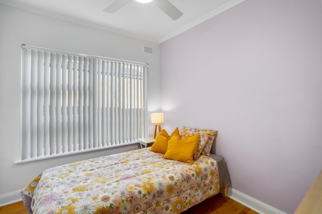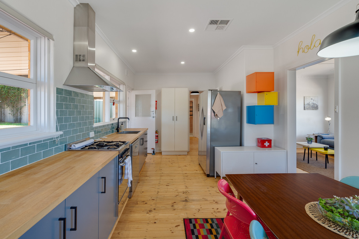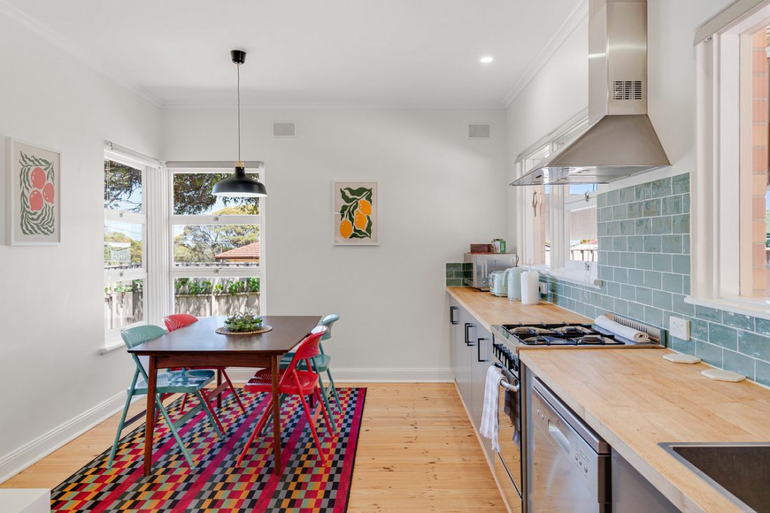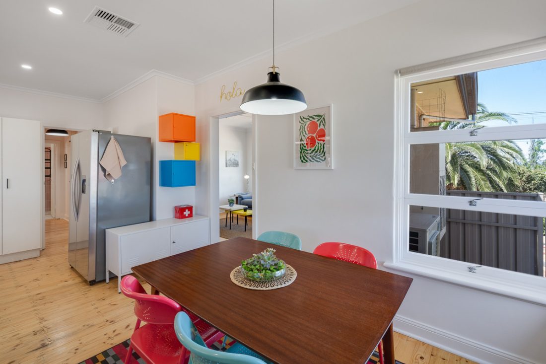 Flowing from the lounge, the open-plan kitchen and meals area is flooded with natural light, creating a cheerful, lively space where cooking and dining are a pleasure. The kitchen’s modern cabinetry, stylish subway tiles, and sleek stainless steel appliances, including a gas cooktop and dishwasher, add to the fresh, contemporary feel.