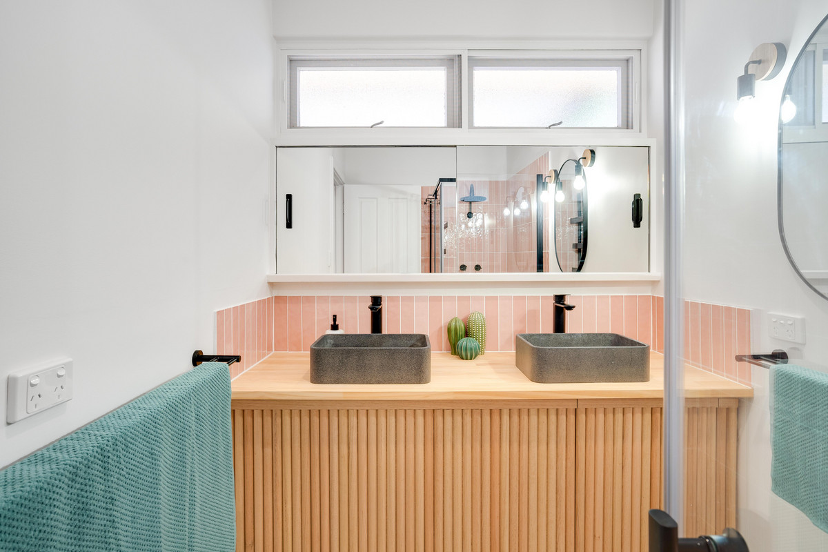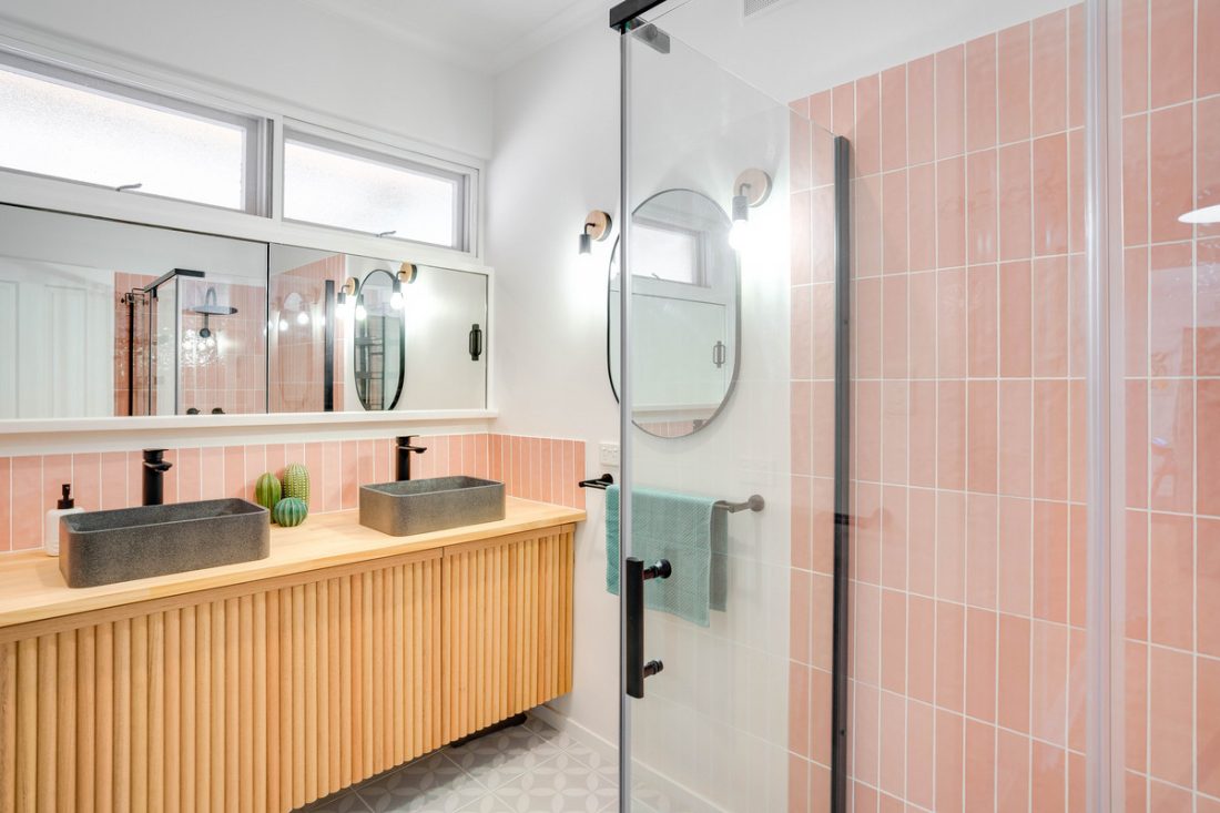 The bathroom brings style and personality into daily routines, featuring vibrant pink tiles, a striking wooden vanity with a double sink, and matte black fixtures. The separate toilet enhances convenience for busy family mornings.