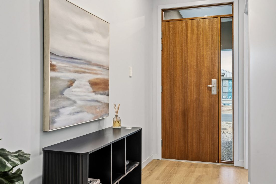 Street appeal is spot on, with an aggregate concrete pathway, striking black brickwork paired with soft render, and a warm timber front door giving a hint of the style waiting inside.