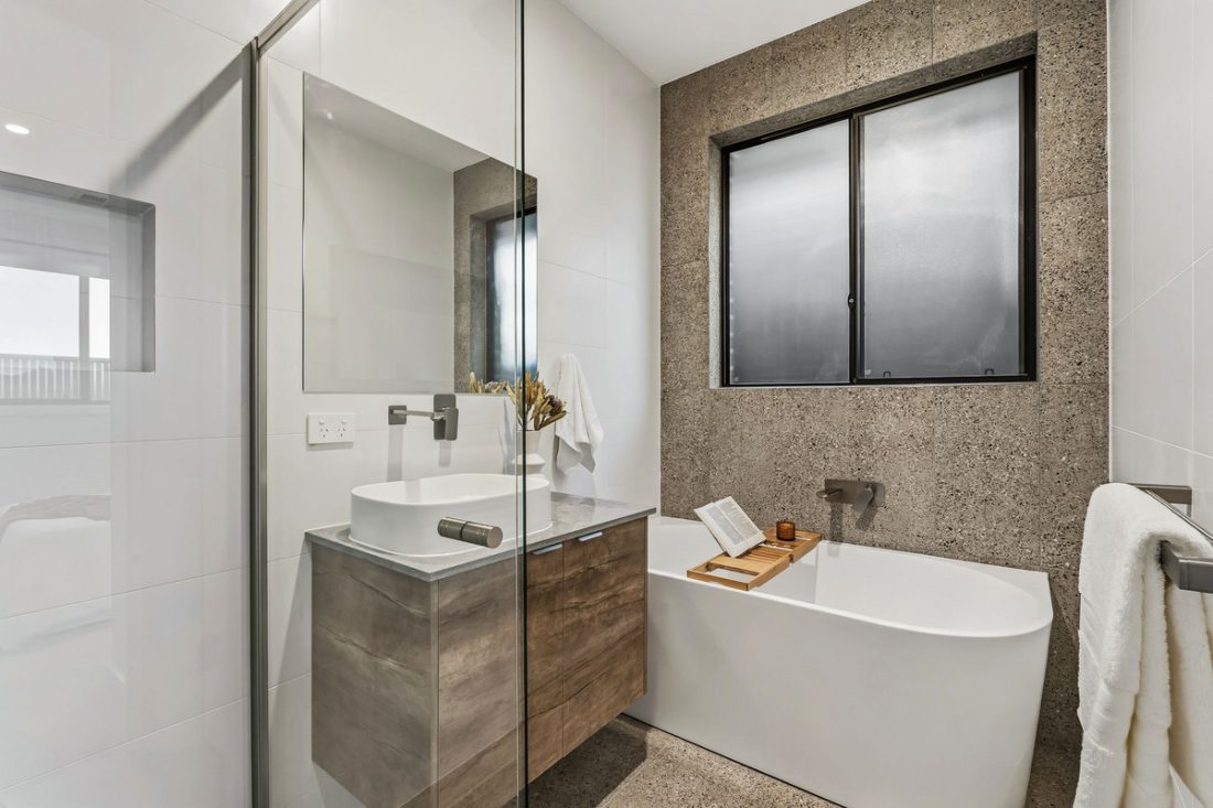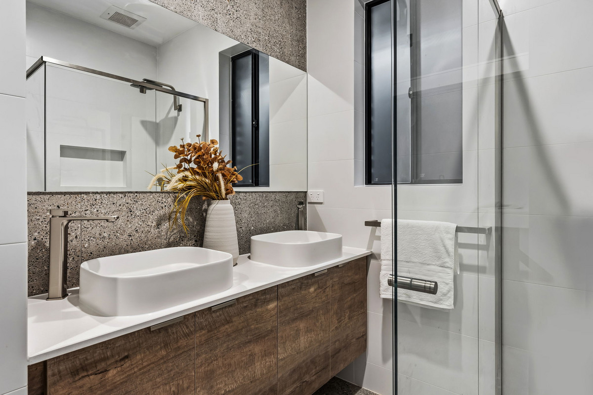 Both bathrooms carry a spa-like feel with warm timber-look vanities and floor-to-ceiling tiling. The ensuite offers double vanities, while the main bathroom includes a deep bath, perfect for end-of-day soaks.