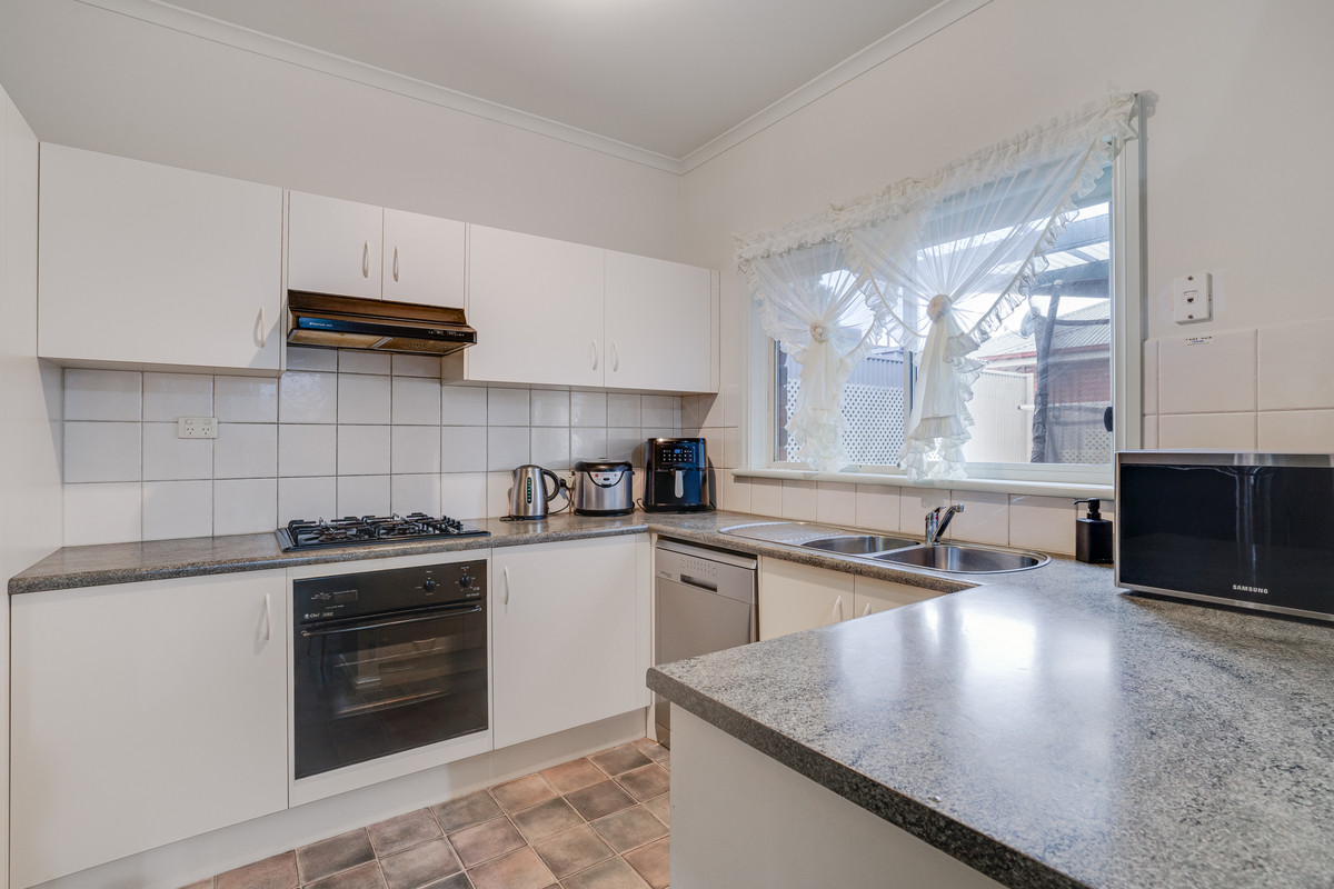 Continue down the hallway to the rear of the home, the open-plan living area. Well-maintained and thoughtfully designed, the kitchen shines with its ample storage, gas stove-top, dishwasher, and natural light flooding through the window above the sink. Plus, a breakfast bar offers a cozy gathering spot for families to enjoy a relaxed meal.