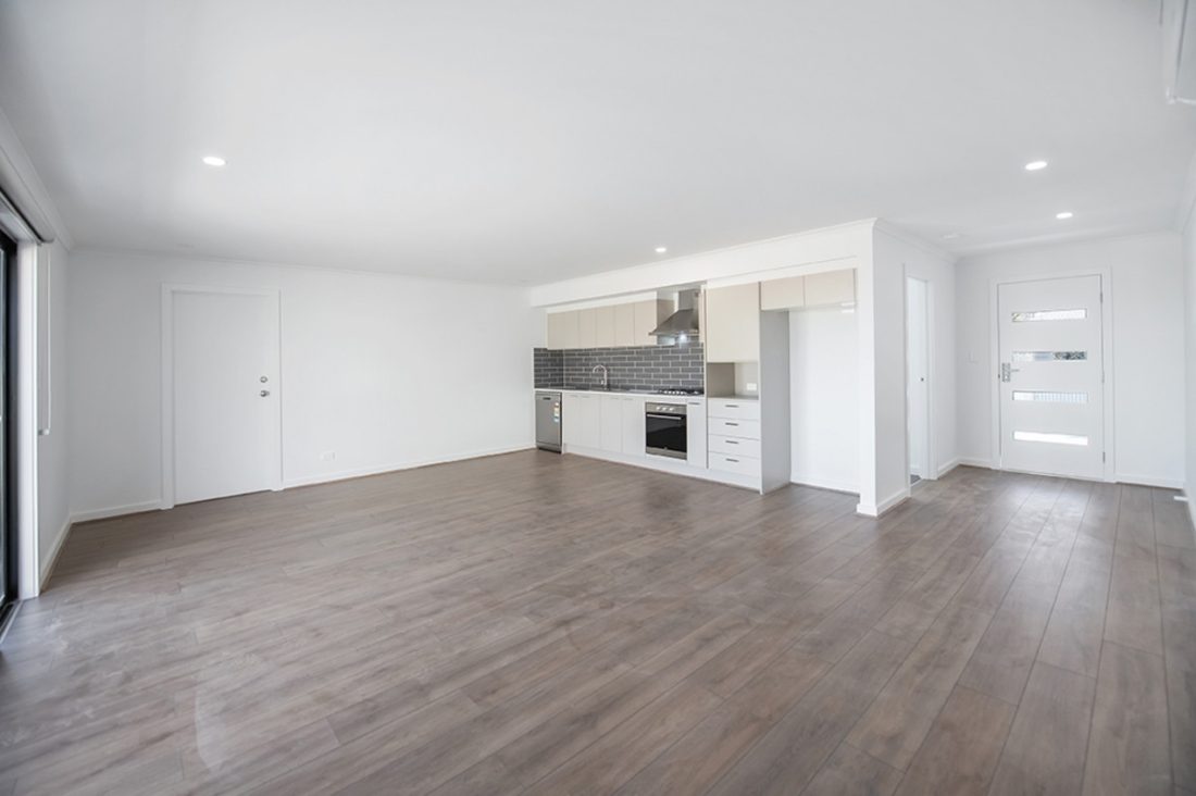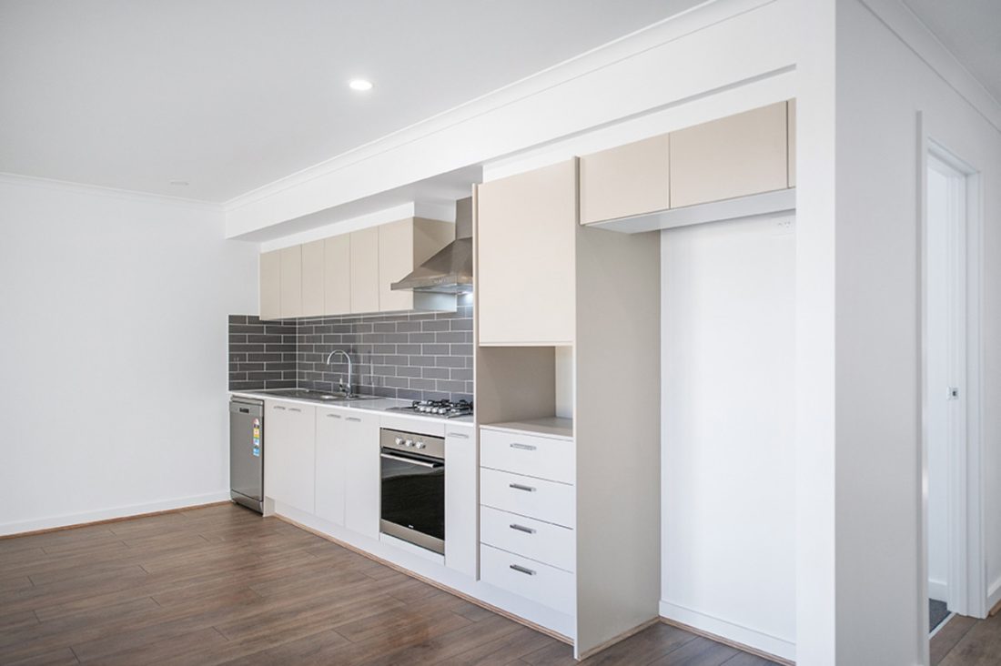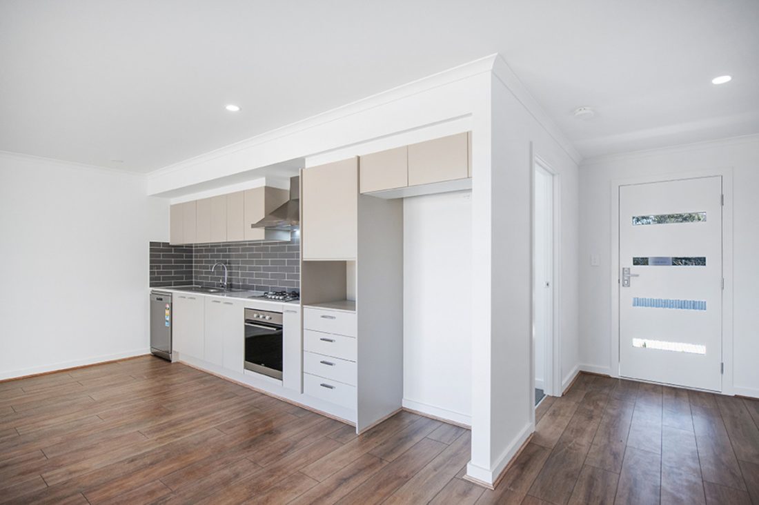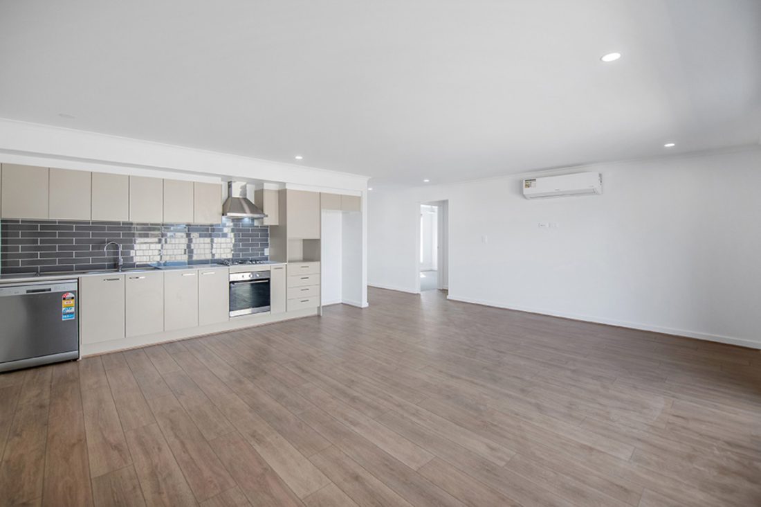Inside, the open-plan kitchen and living area immediately greets you, a spacious and inviting setting for both everyday living and social gatherings. The kitchen features sleek, stylish aesthetics with a subway tiled splash-back and stainless steel appliances, including a gas cooktop and dishwasher.
