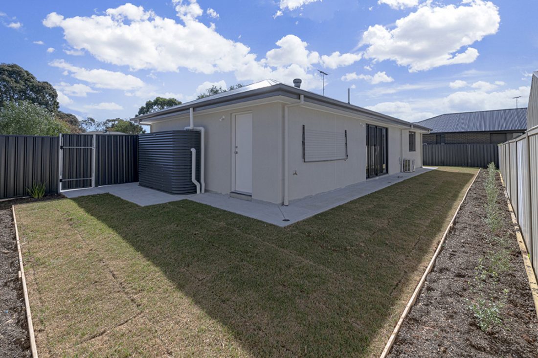 Sliding glass doors effortlessly connect the interior to the exterior, where a delightful yard becomes a natural extension of the lounge space. Neatly lawned with garden beds around the perimeter, this space is perfect for those seeking a little bit of space for pets, kids, or simply enjoying the sunshine.