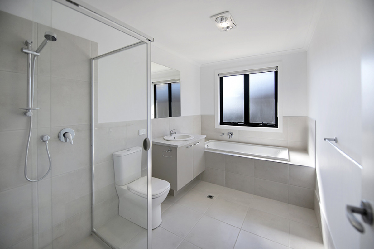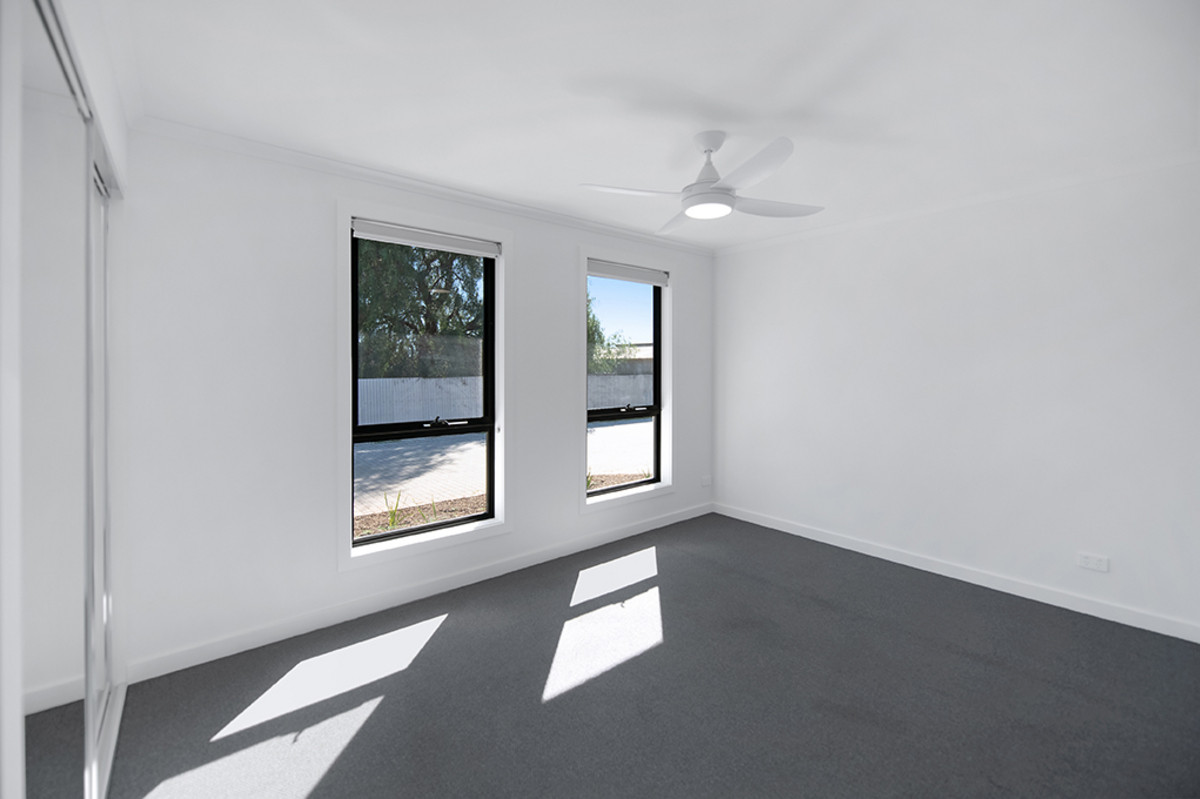 Back inside, discover three good-sized bedrooms, each with ceiling fans, built-in wardrobes and plenty of natural light. The bathroom is generously sized, featuring stylish grey tiling, a bath, shower, and vanity with ample storage.