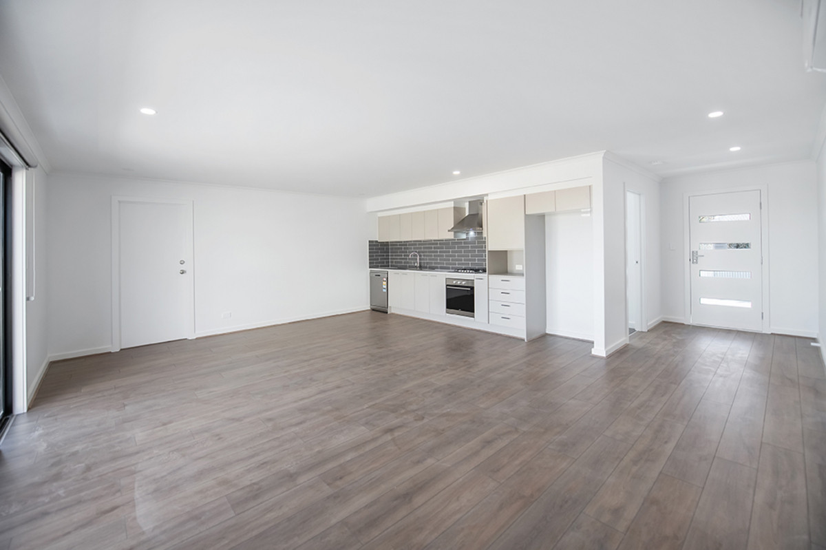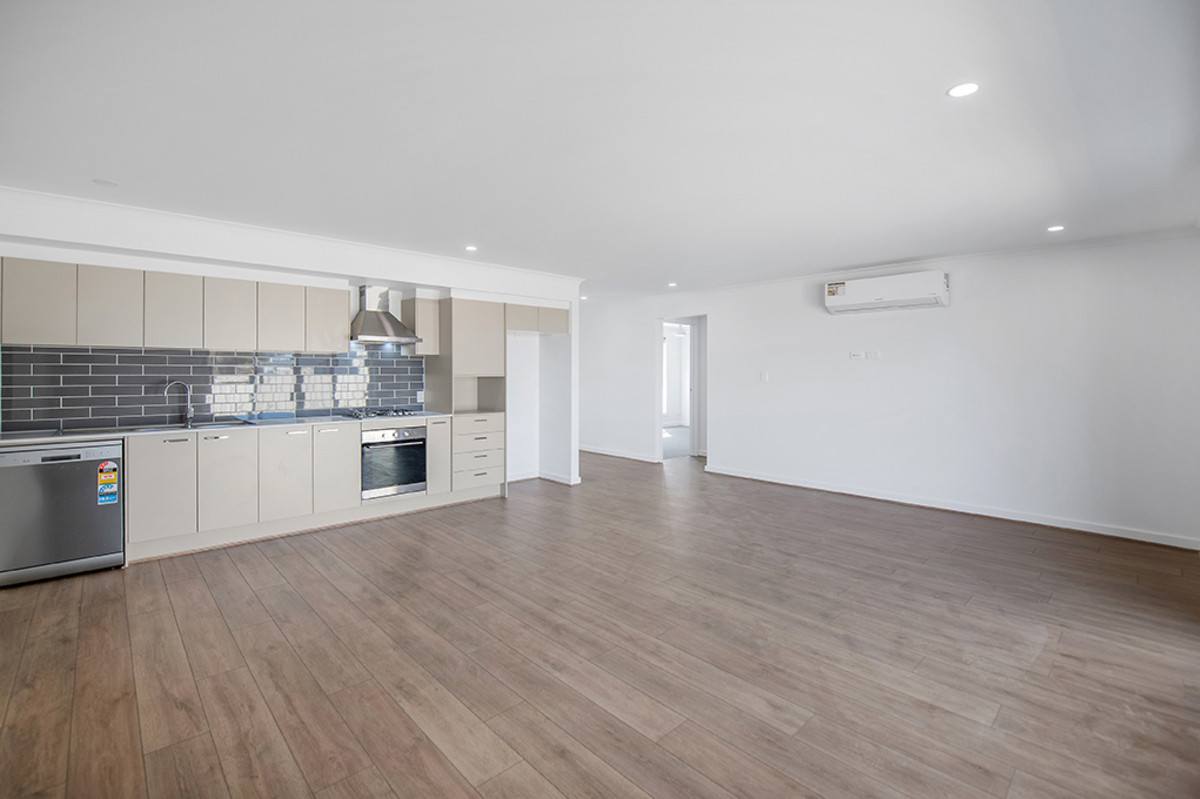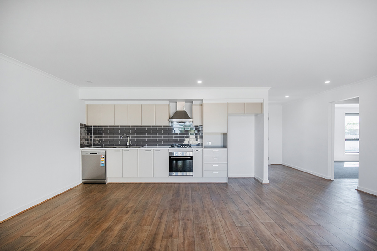 Inside, the open-plan kitchen and living area immediately greets you, a spacious and inviting setting for both everyday living and social gatherings. The kitchen features sleek, stylish aesthetics with a subway tiled splash-back and stainless steel appliances, including a gas cooktop and dishwasher.