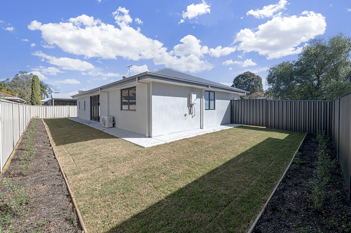 Sliding glass doors effortlessly connect the interior to the exterior, where a delightful yard becomes a natural extension of the lounge space. Neatly lawned with garden beds around the perimeter, this space is perfect for those seeking a little bit of space for pets, kids, or simply enjoying the sunshine.