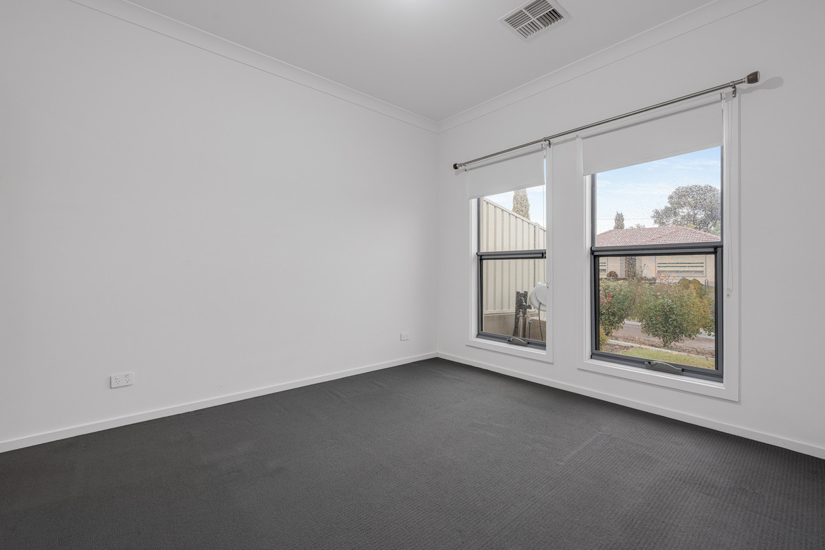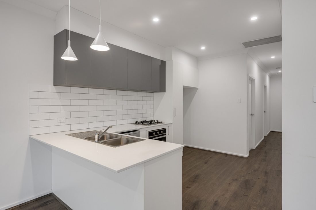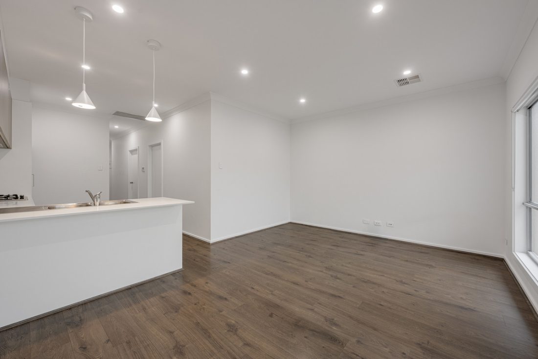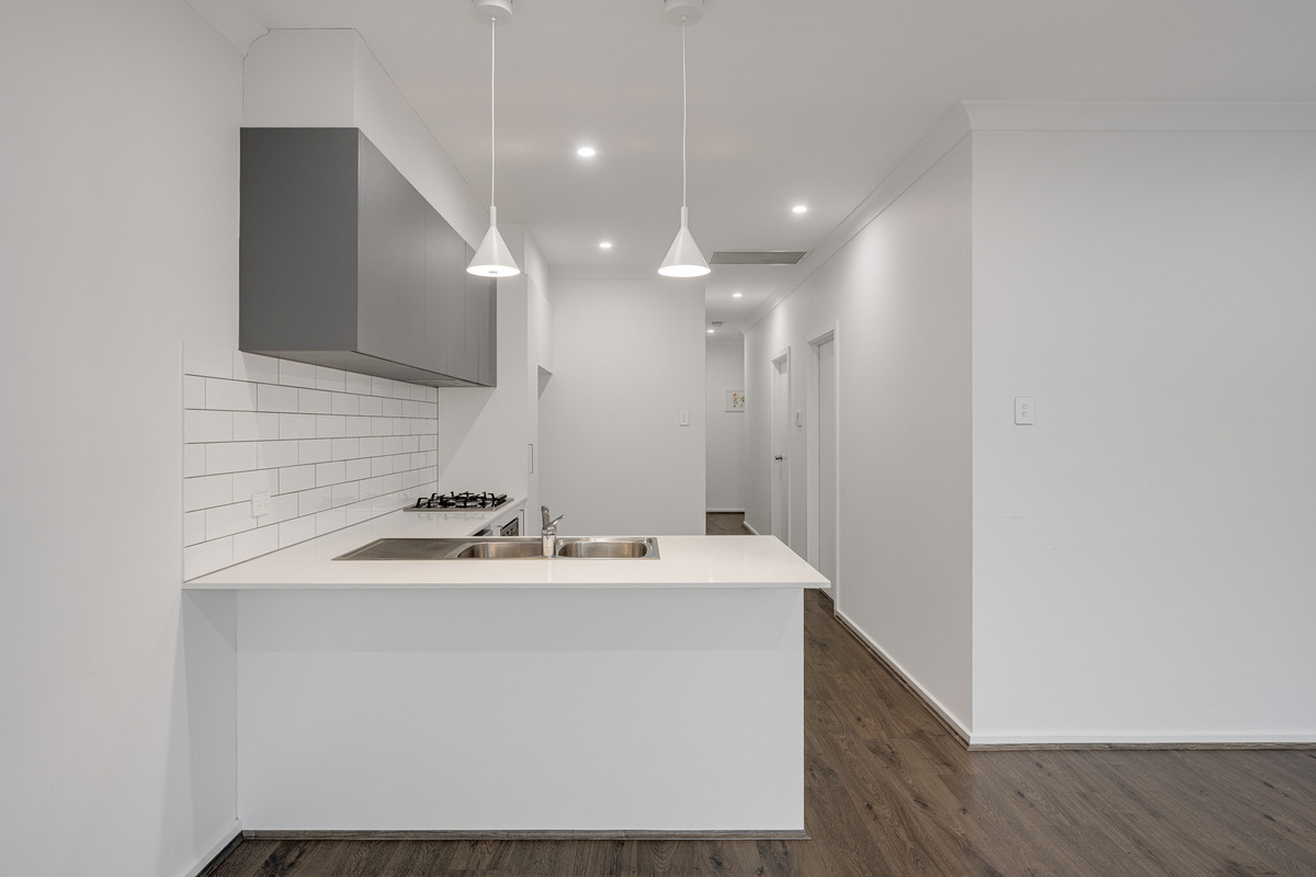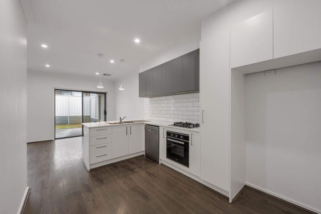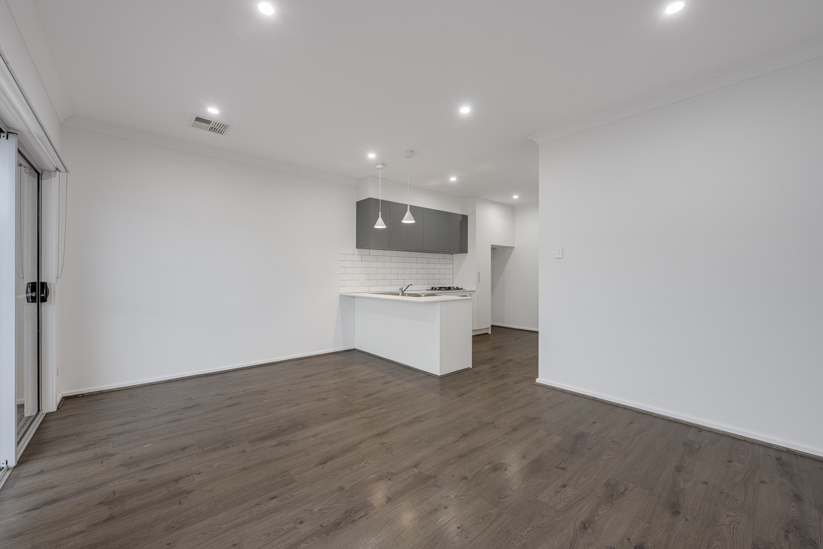 Behind its sleek rendered façade and panel lift garage door lies a thoughtfully designed interior featuring timber-look floating floors and a naturally light-filled open plan layout. The spacious kitchen, living, and dining area is perfect for everyday living and entertaining, complete with stainless steel appliances, a gas cooktop, an abundance of cabinetry, and a chic subway-tiled splash back.