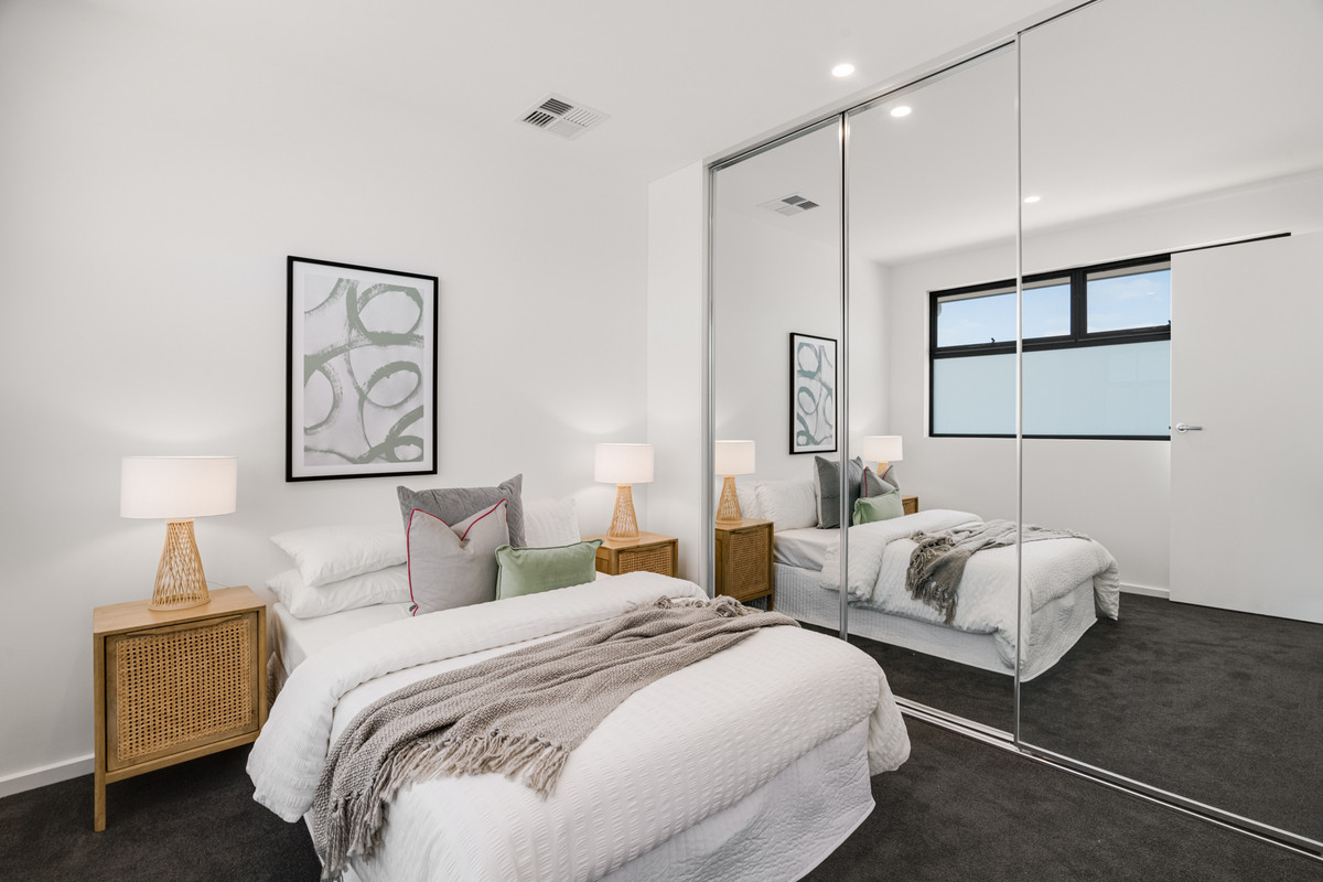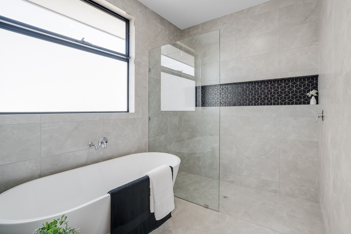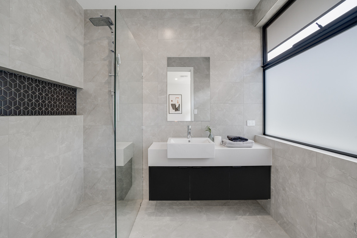 – Stone surfaces and floor-to-ceiling tiling to wet areas
