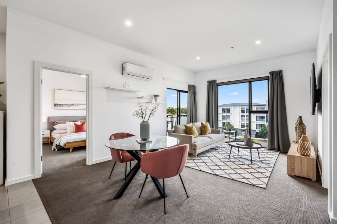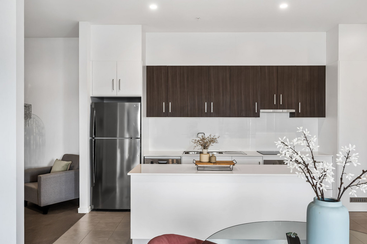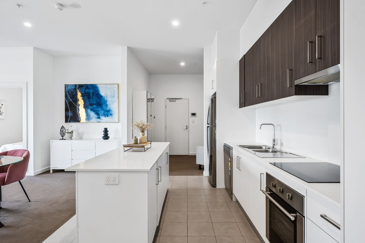 Freshly painted throughout, this stylish apartment boasts soaring 3-meter ceilings that amplify its sense of space and light. The open-plan living and dining area, adorned with plush carpeting, seamlessly connects to a private balcony, providing the ideal setting for relaxation or entertaining, with uninterrupted lake views as your backdrop.