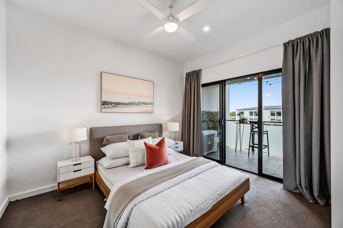 The two bedrooms, both fitted with mirrored built-in robes and ceiling fans, provide a comfortable retreat. The master bedroom enjoys direct access to the balcony, enhancing its appeal. The main bathroom is pristine and functional, with a shower and toilet in clean, minimalist white tones.