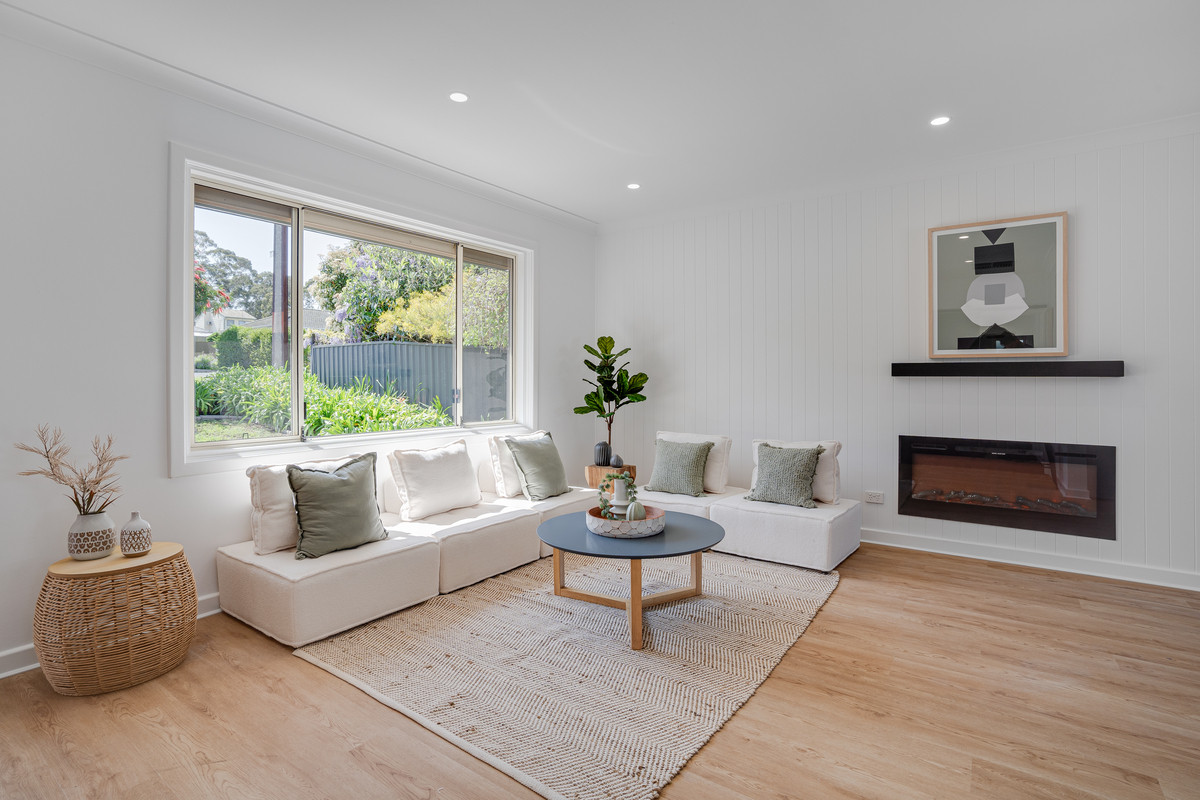 The expansive formal living and dining area, bathed in natural light, provides the perfect backdrop for family gatherings and special occasions. Here, a featured fireplace and timber vertical panelling create a cosy spot that you’ll never want to leave.