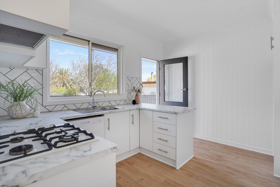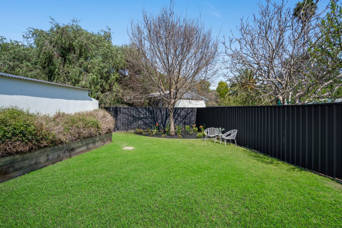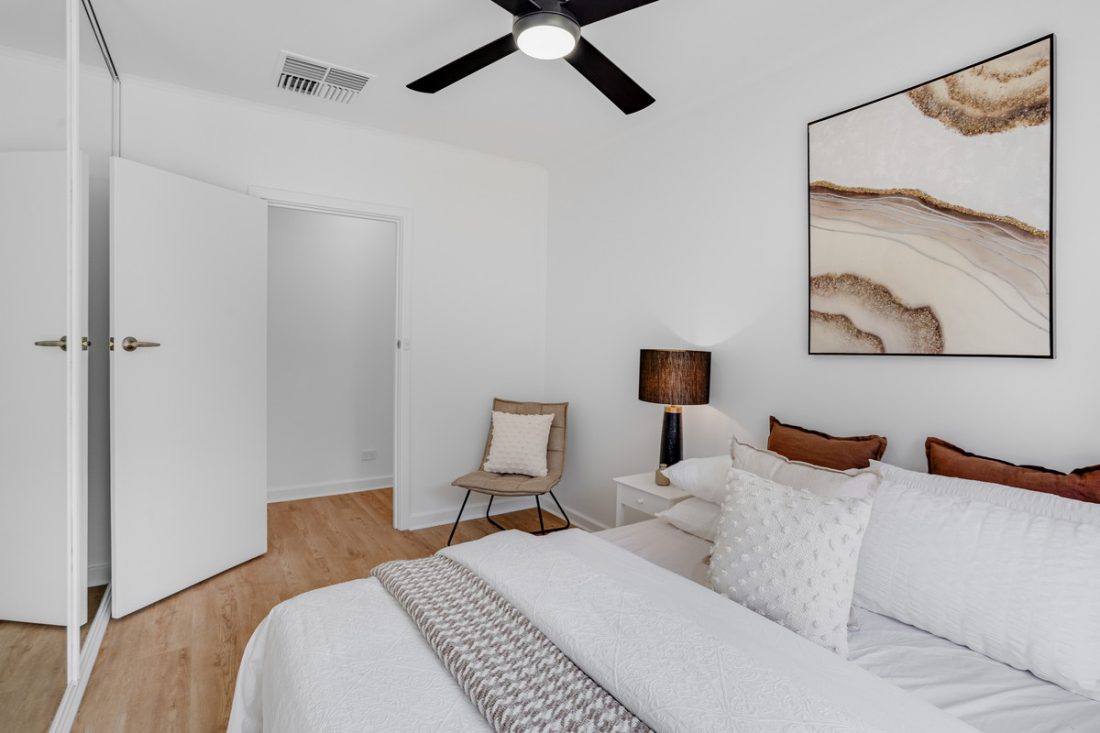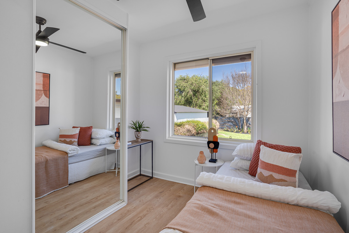 The generous master suite offers uninterrupted views of the charming streetscape, along with a large built-in robe and a stylish black ceiling fan. Two additional bedrooms continue the hybrid flooring, also equipped with built in robes for all your storage needs. Each featuring black ceiling fans and wide windows that flood the rooms with natural light.