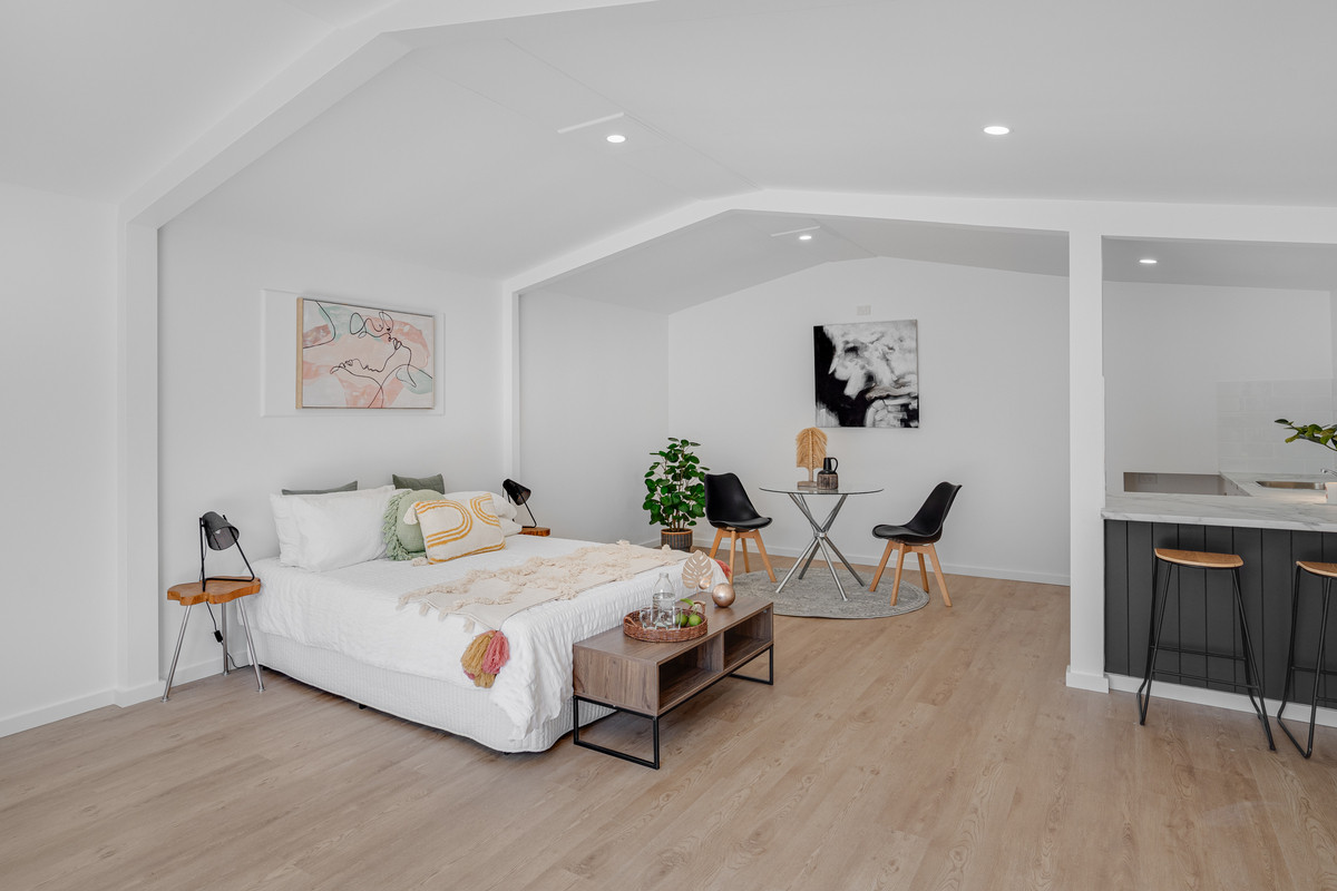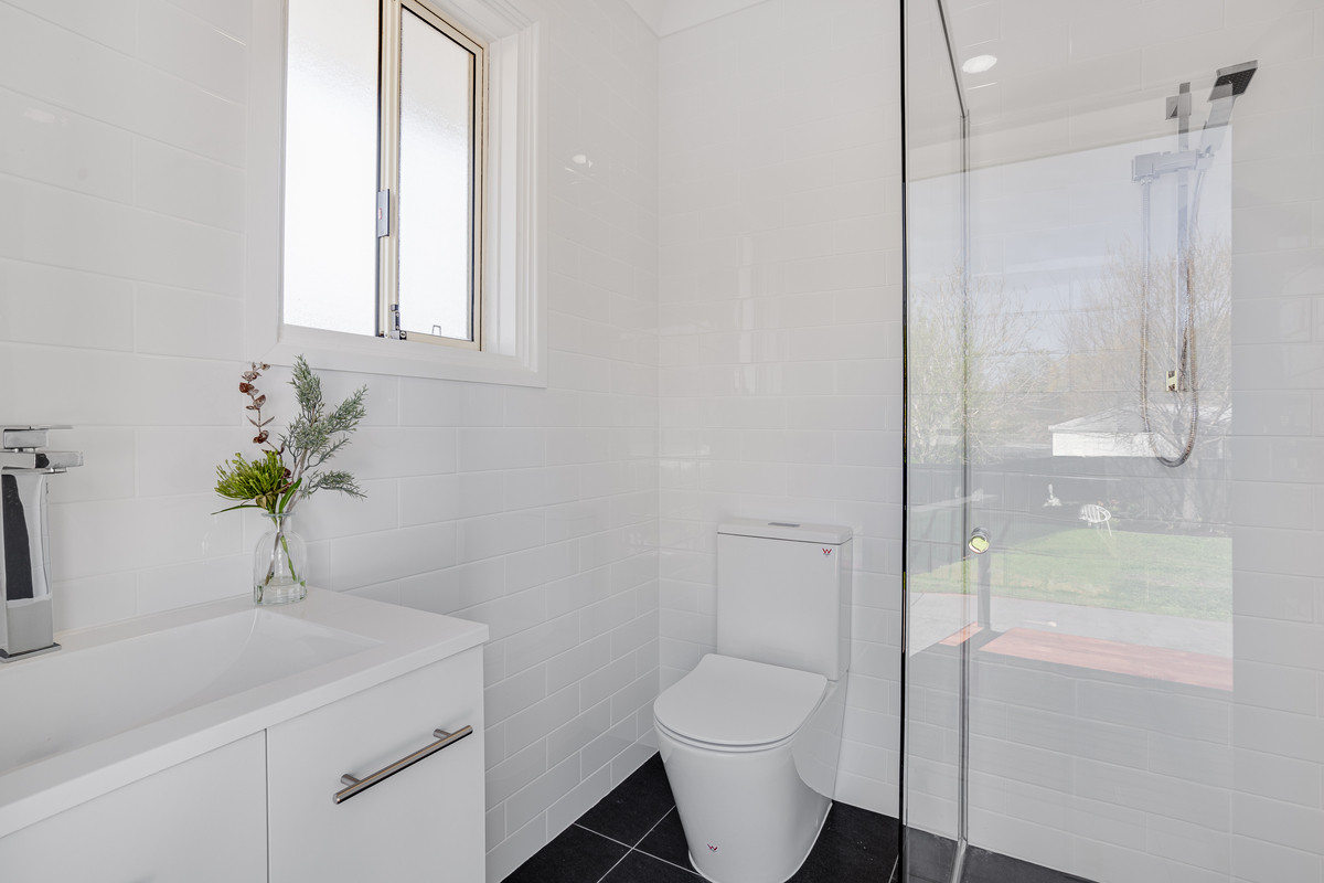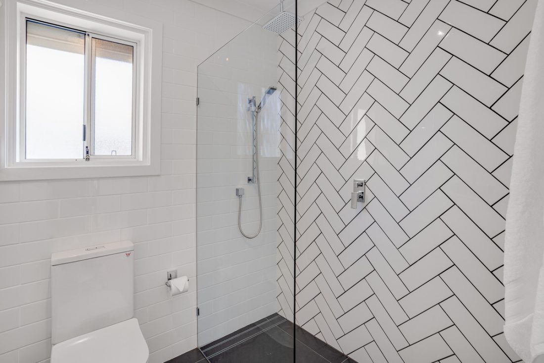 The main bathroom is a true masterpiece, featuring open walk-in rain shower, elegant herringbone feature tiling and a sleek wall to wall vanity space to accommodate your laundry needs.