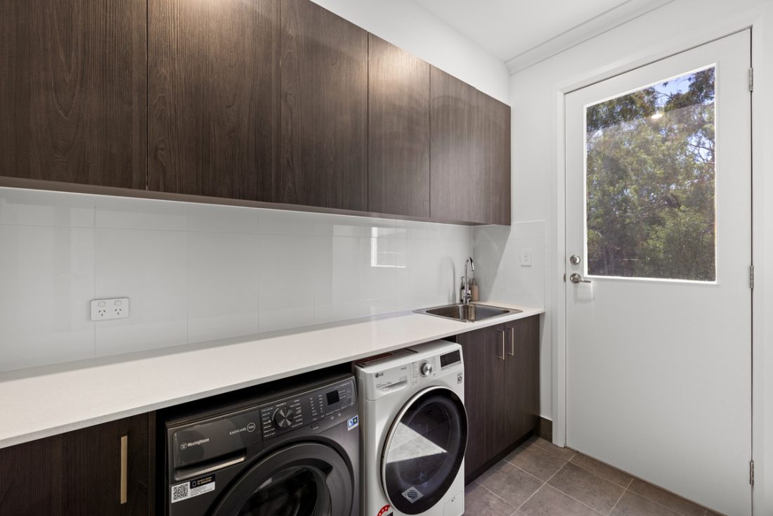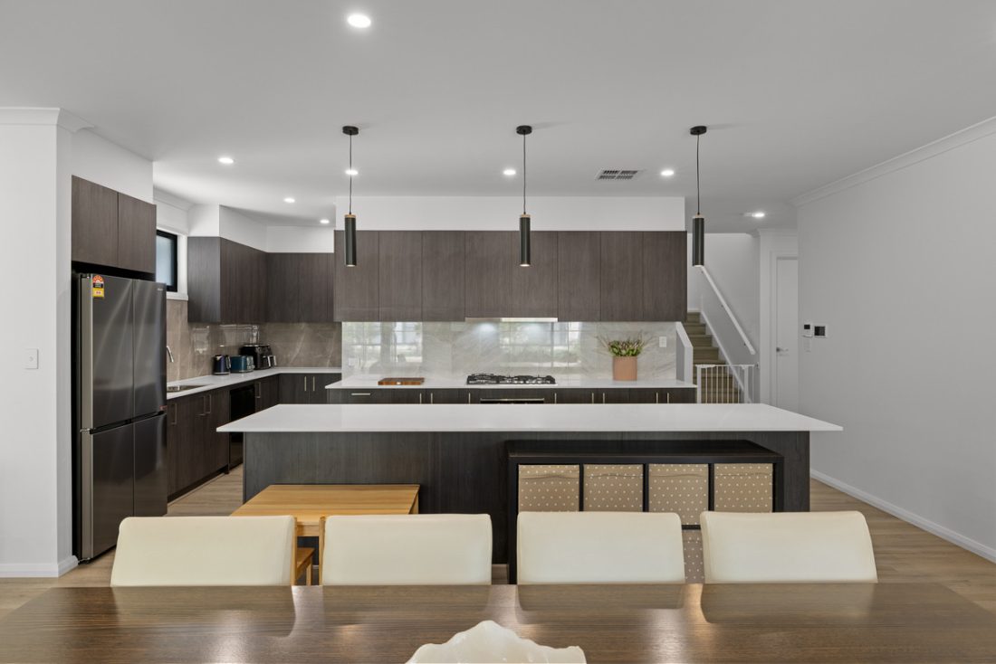 Kitchen style leans a little moodier, with sleek cabinetry, loads of bench space and a walk-in butler’s pantry keeping everyday clutter tucked neatly out of sight. Stainless steel appliances including a gas cooktop and dishwasher make cooking easy, while the breakfast bar is perfect for morning coffees or a quick bite before heading out the door.