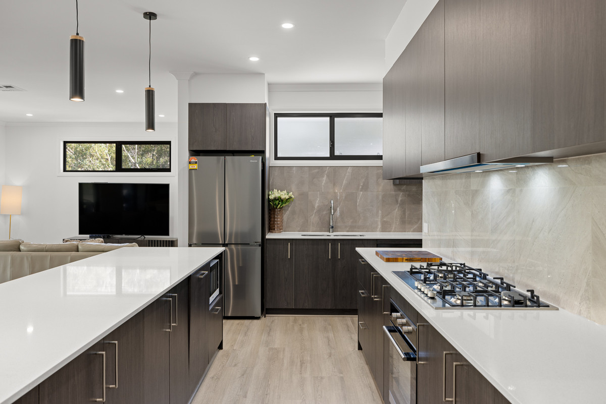 Kitchen style leans a little moodier, with sleek cabinetry, loads of bench space and a walk-in butler’s pantry keeping everyday clutter tucked neatly out of sight. Stainless steel appliances including a gas cooktop and dishwasher make cooking easy, while the breakfast bar is perfect for morning coffees or a quick bite before heading out the door.