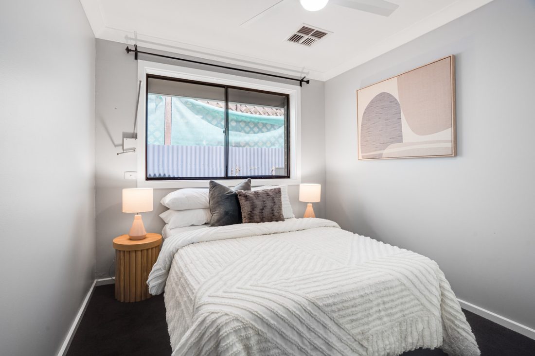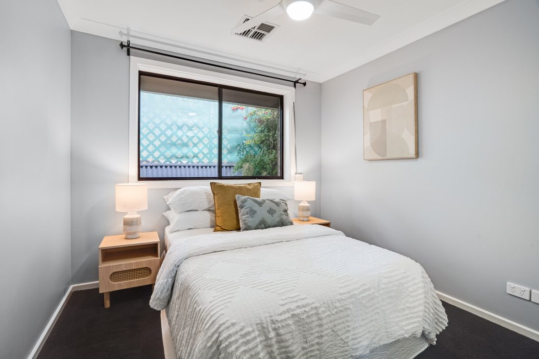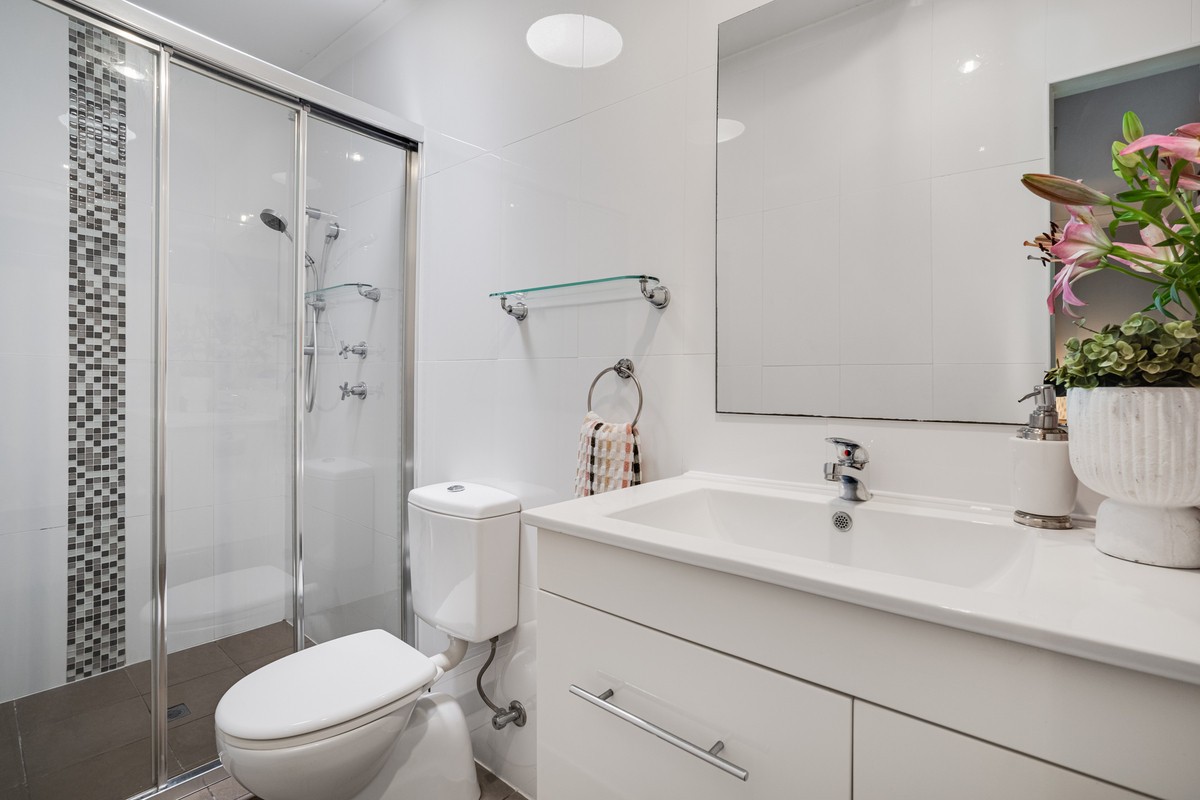 The master bedroom is a retreat, offering plush carpeting, a ceiling fan, and a modern floor-to-ceiling tiled ensuite. Three additional bedrooms come complete with plush carpeting, wide windows, and built-in robes for the whole family.