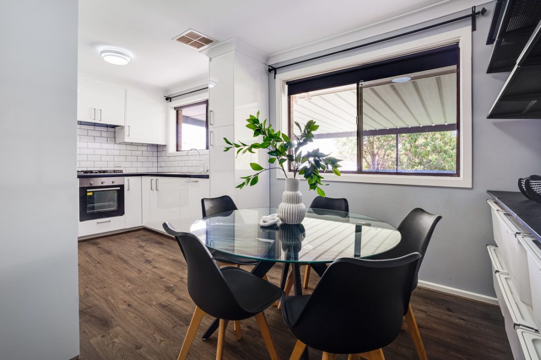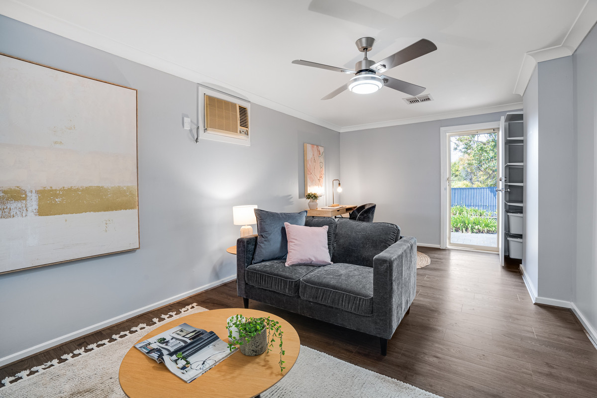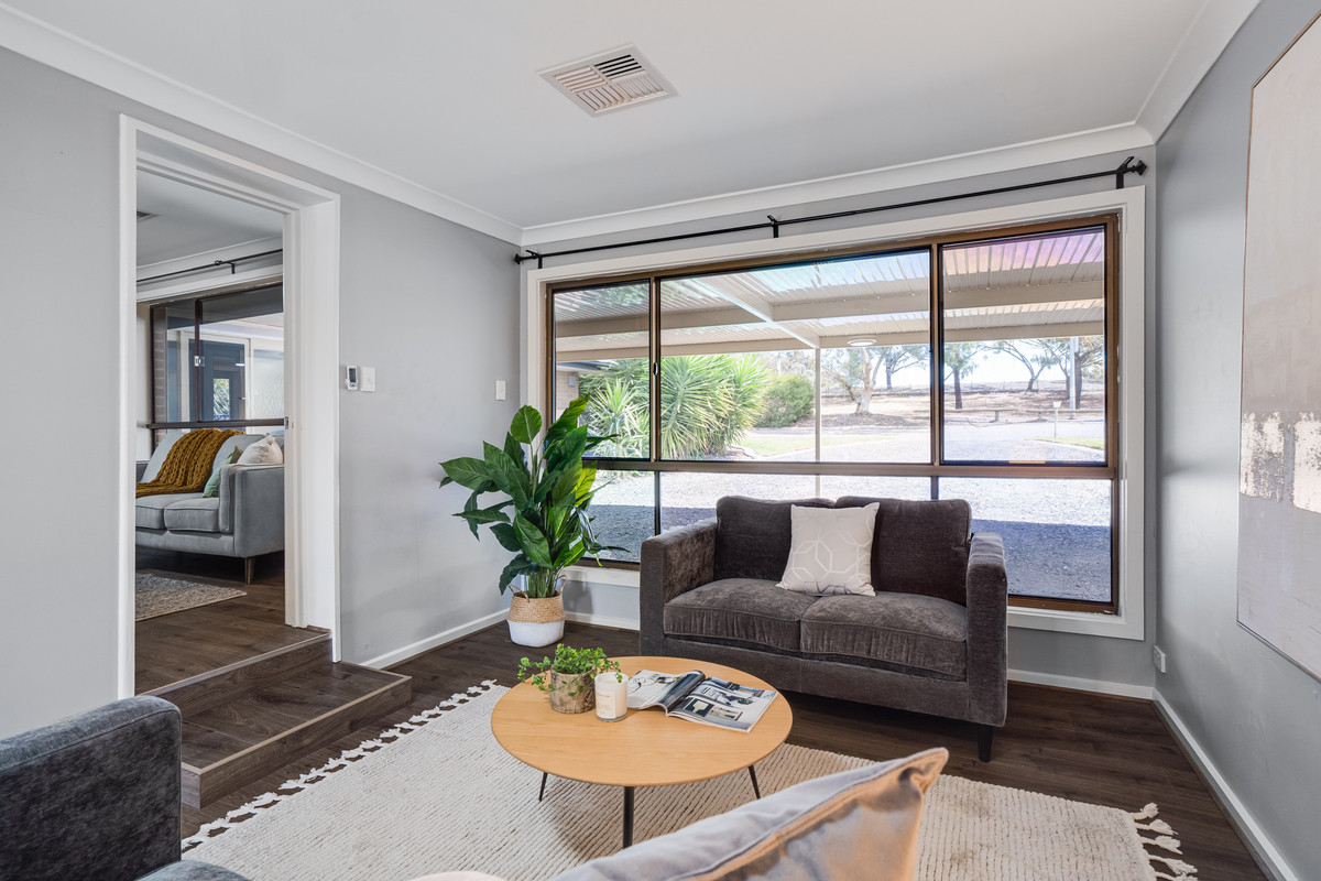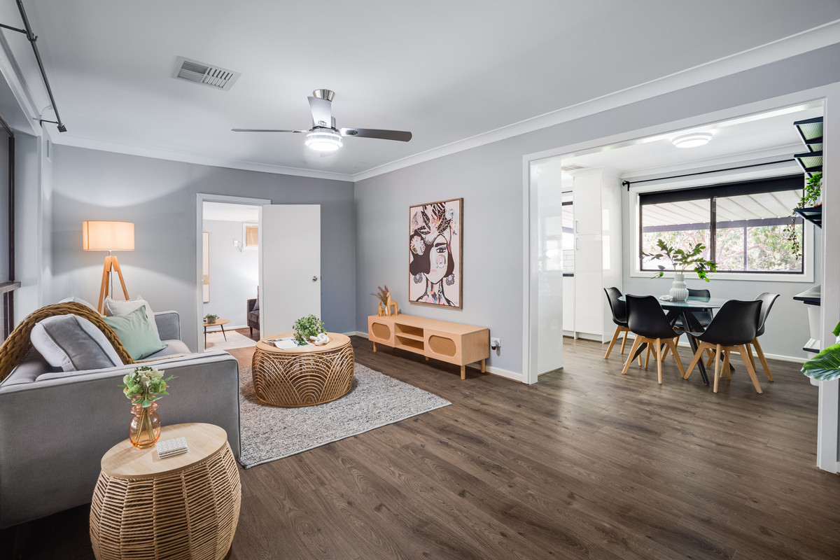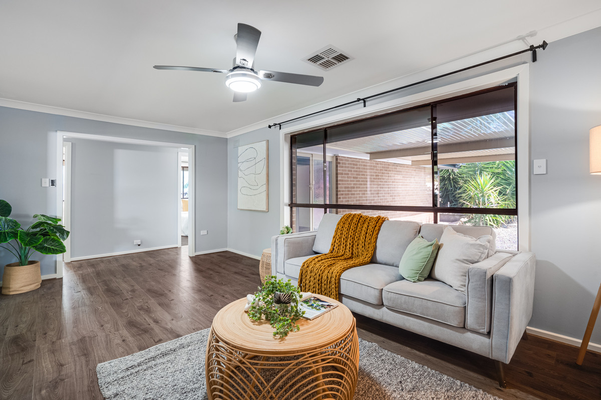 The home welcomes you with a timeless and welcoming charm. As you step inside, you’ll be greeted by warm timber-look floating flooring that seamlessly leads you through the house. The large formal living room features a ceiling fan and wide windows, making it the perfect space for relaxation and entertaining.