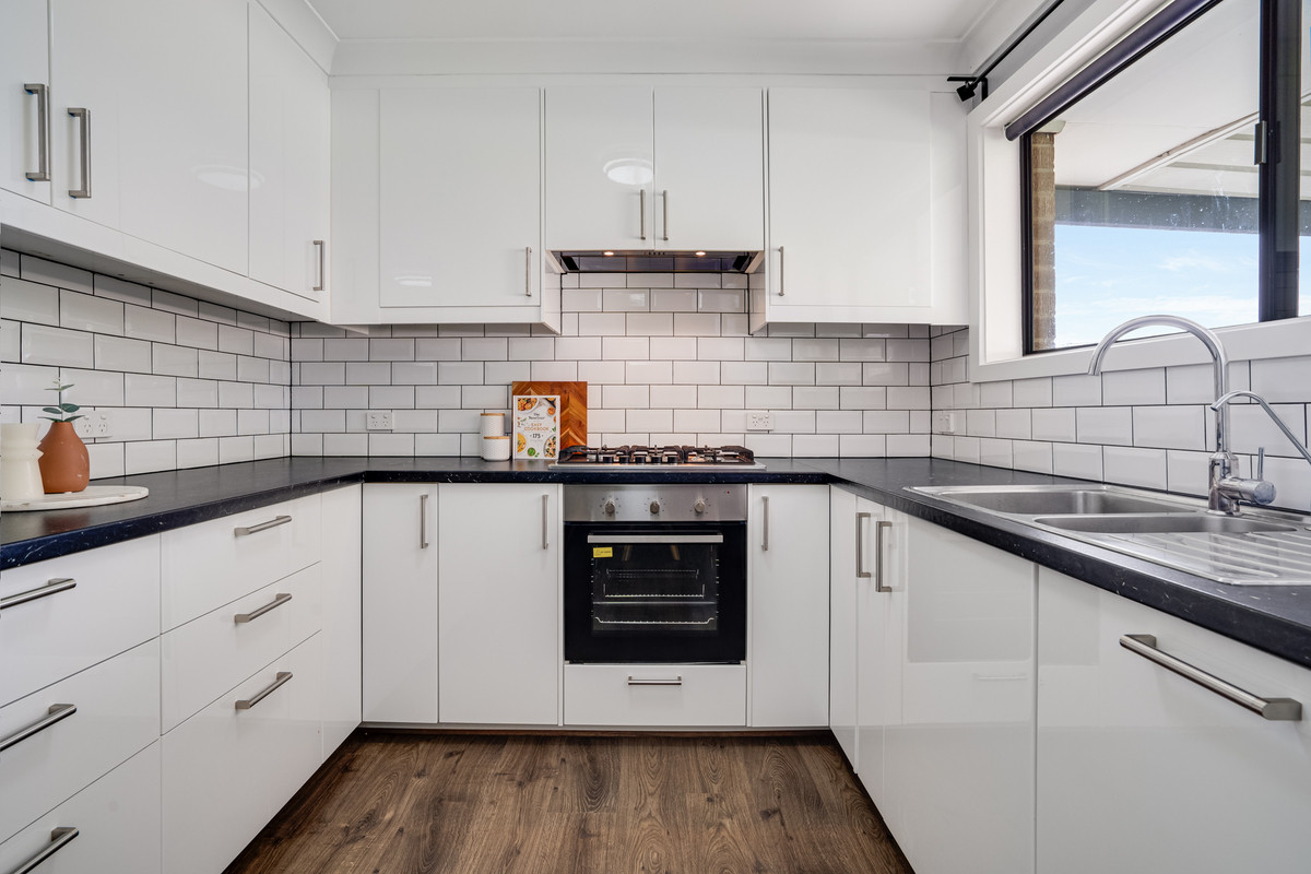 – Stylish kitchen with gas cooktop & tiled splash-back