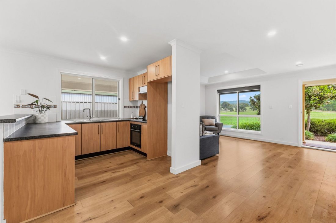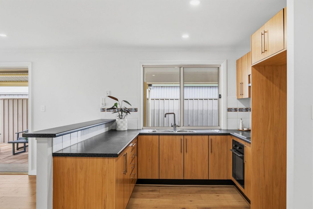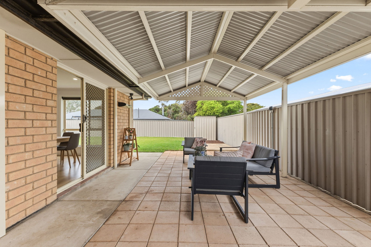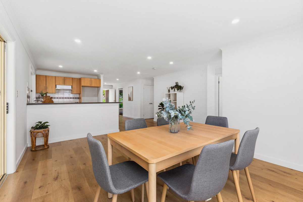 Moving through, the heart of the home opens into a well-sized kitchen and dining area. The kitchen is practical and well-equipped with a wall oven, cooktop, double sink, and ample cabinetry, all overlooking the dining space. Glass sliding doors extend the living outdoors to a paved undercover entertaining area, ideal for weekend catch-ups or quiet mornings with a coffee, all framed by lush lawn, established gardens, two garden sheds, and a rainwater tank.