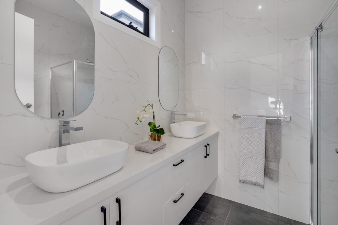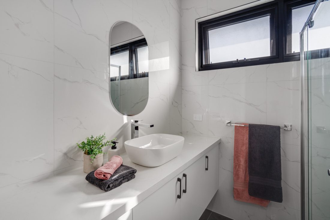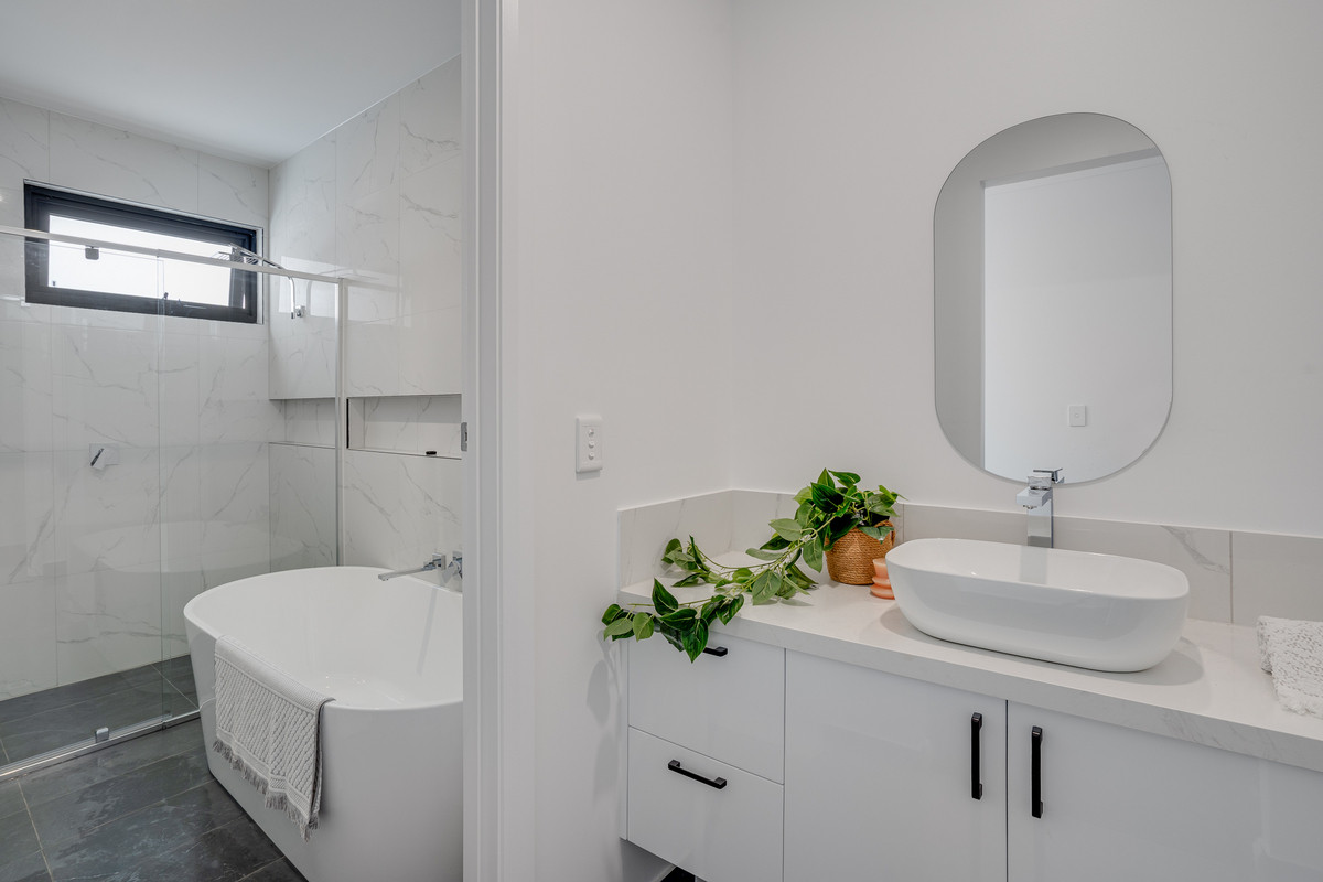 All three bathrooms in this home boast a harmonious design. From the high-quality fixtures to the stone bench-tops and floor-to-ceiling tiling, every detail has been carefully chosen to create a cohesive and luxurious atmosphere.