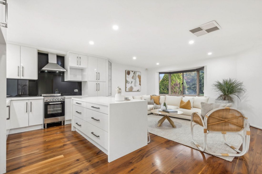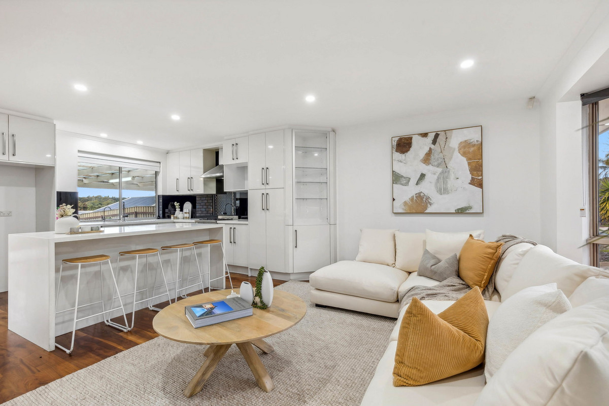 The kitchen boasts sleek cabinetry, stone bench-tops, a glass splash back, large island and stainless steel appliances including a gas cook-top and dishwasher. A charming lounge and bright dining space effortlessly flows from here, fostering connectivity for entertaining guests. Enjoy an additional sitting area beyond the dining space, the perfect solution for a reading nook, study space or kids play area.