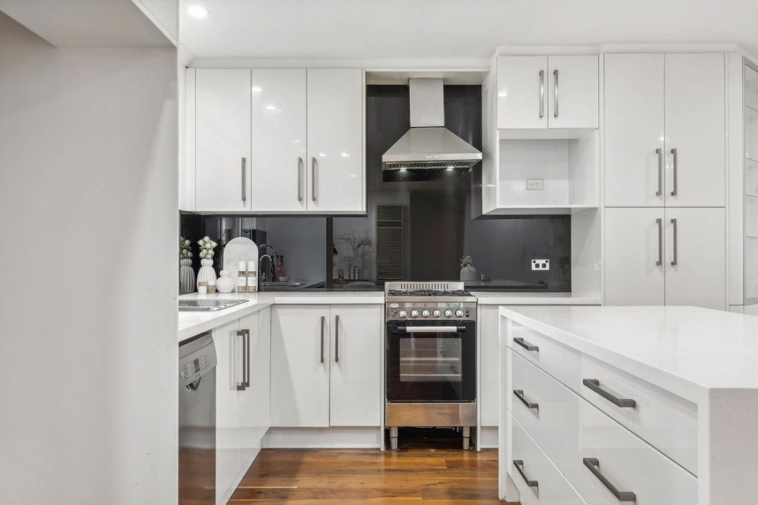 – Beautifully renovated kitchen features sleek cabinetry, stone bench-tops, glass splash back, large island and stainless steel appliances including a gas cook-top and dishwasher